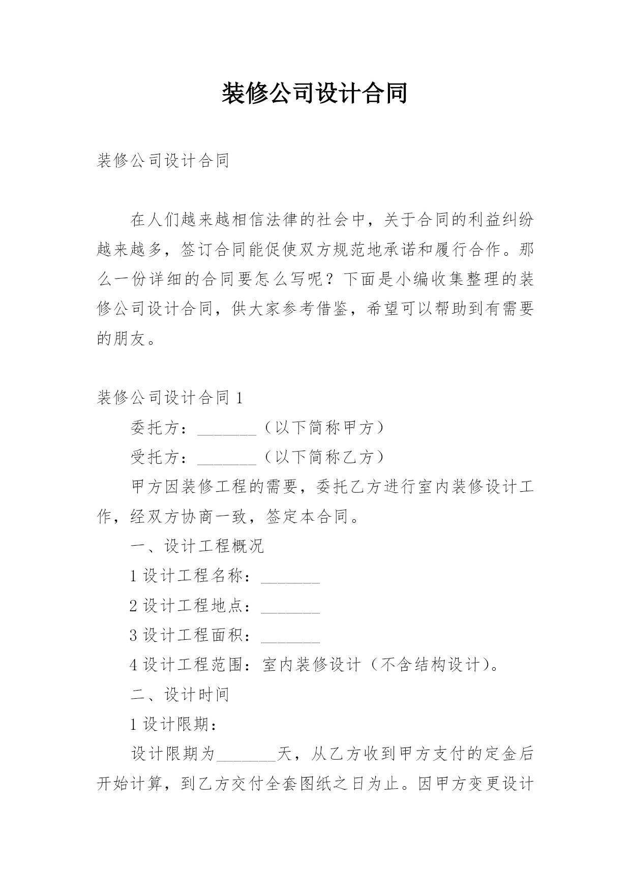 装修公司设计合同装修公司设计合同在人们越来越相信法律的社会中,关于合同的利益纠纷越来越多,签订合同能促使双方规范地承诺和履行合作。那么一份详细的合同要怎么写呢?下面是小编收集整理的装修公司设计合同,供大家参考借鉴,希望可以帮助到有需要的朋友。装修公司设计合同1委托方:_______(以下简称甲方)受托方:_______(以下简称乙方)甲方因装修工程的需要,委托乙方进行室内装修设计工作,经双方协商一致,签定本合同。一、设计工程概况1设计工程名称:_______2设计工程地点:_______3设计工程面积:_