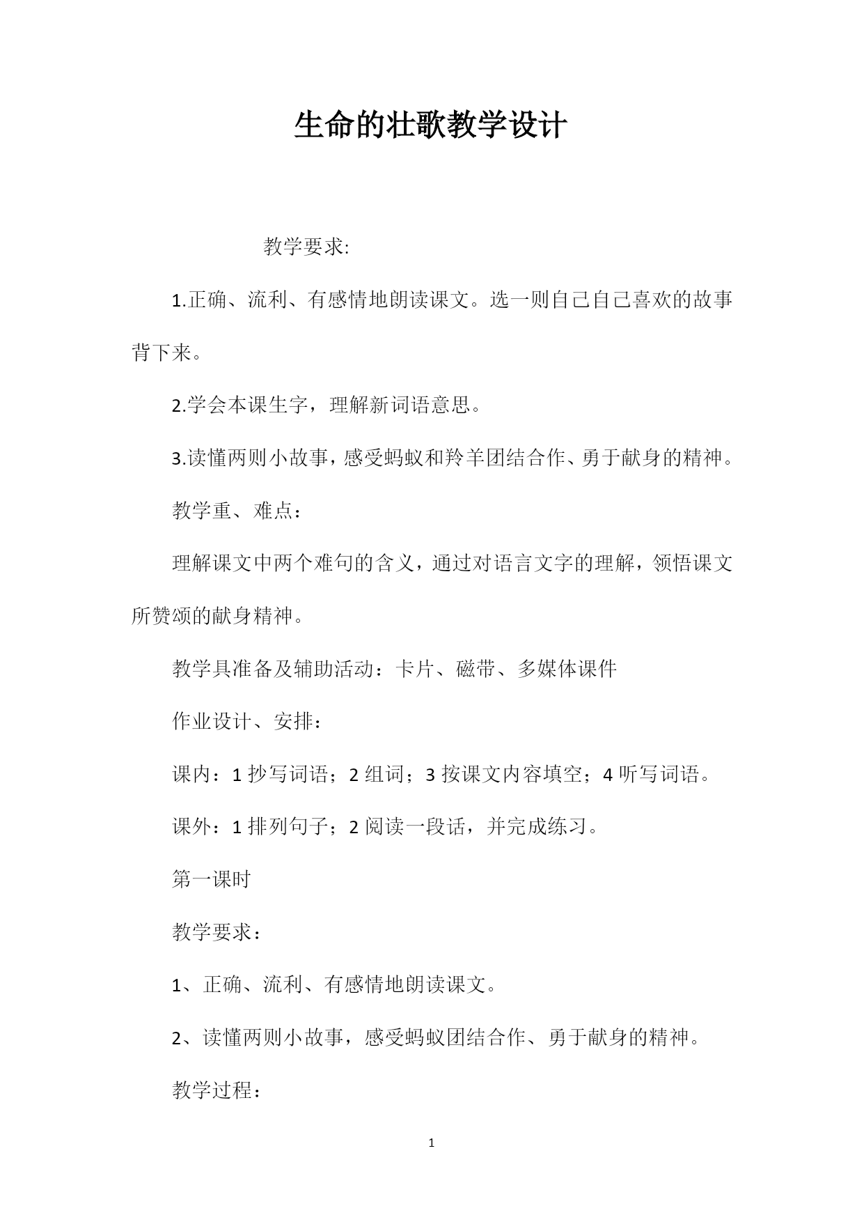 PAGEPAGE6生命的壮歌教学设计教学要求:1.正确、流利、有感情地朗读课文。选一则自己自己喜欢的故事背下来。2.学会本课生字,理解新词语意思。3.读懂两则小故事,感受蚂蚁和羚羊团结合作、勇于献身的精神。教学重、难点:理解课文中两个难句的含义,通过对语言文字的理解,领悟课文所赞颂的献身精神。教学具准备及辅助活动:卡片、磁带、多媒体课件作业设计、安排:课内:1抄写词语;2组词;3按课文内容填空;4听写词语。课外:1排列句子;2阅读一段话,并完成练习。第一课时教学要求:1、正确、流利、有感情地朗