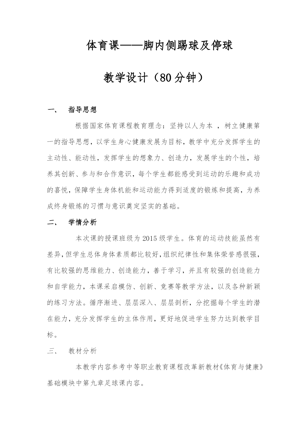 体育课——脚内侧踢球及停球教学设计(80分钟)指导思想根据国家体育课程教育理念:坚持以人为本,树立健康第一的指导思想,以学生身心健康发展为目标,教学中充分发挥学生的主动性、能动性,发挥学生的想象力、创造力,发展学生的个性,培养其创新、参与和合作意识,每个学生都能感受到运动的乐趣和成功的喜悦,保障学生身体机能和运动能力得到适度的锻炼和提高,为养成终身锻炼的习惯与意识奠定坚实的基础。学情分析本次课的授课班级为2015级学生。体育的运动技能虽然有差异,但学生总体身体素质都比较好,组织纪律性和集体荣誉感很强,有比