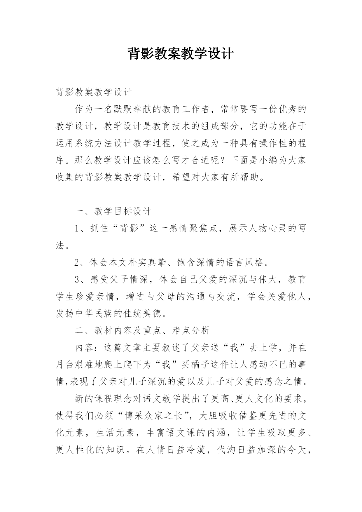 背影教案教学设计背影教案教学设计作为一名默默奉献的教育工作者,常常要写一份优秀的教学设计,教学设计是教育技术的组成部分,它的功能在于运用系统方法设计教学过程,使之成为一种具有操作性的程序。那么教学设计应该怎么写才合适呢?下面是小编为大家收集的背影教案教学设计,希望对大家有所帮助。一、教学目标设计1、抓住“背影”这一感情聚焦点,展示人物心灵的写法。2、体会本文朴实真挚、饱含深情的语言风格。3、感受父子情深,体会自己父爱的深沉与伟大,教育学生珍爱亲情,增进与父母的沟通与交流,学会关爱他人,发扬中华民族的佳统美