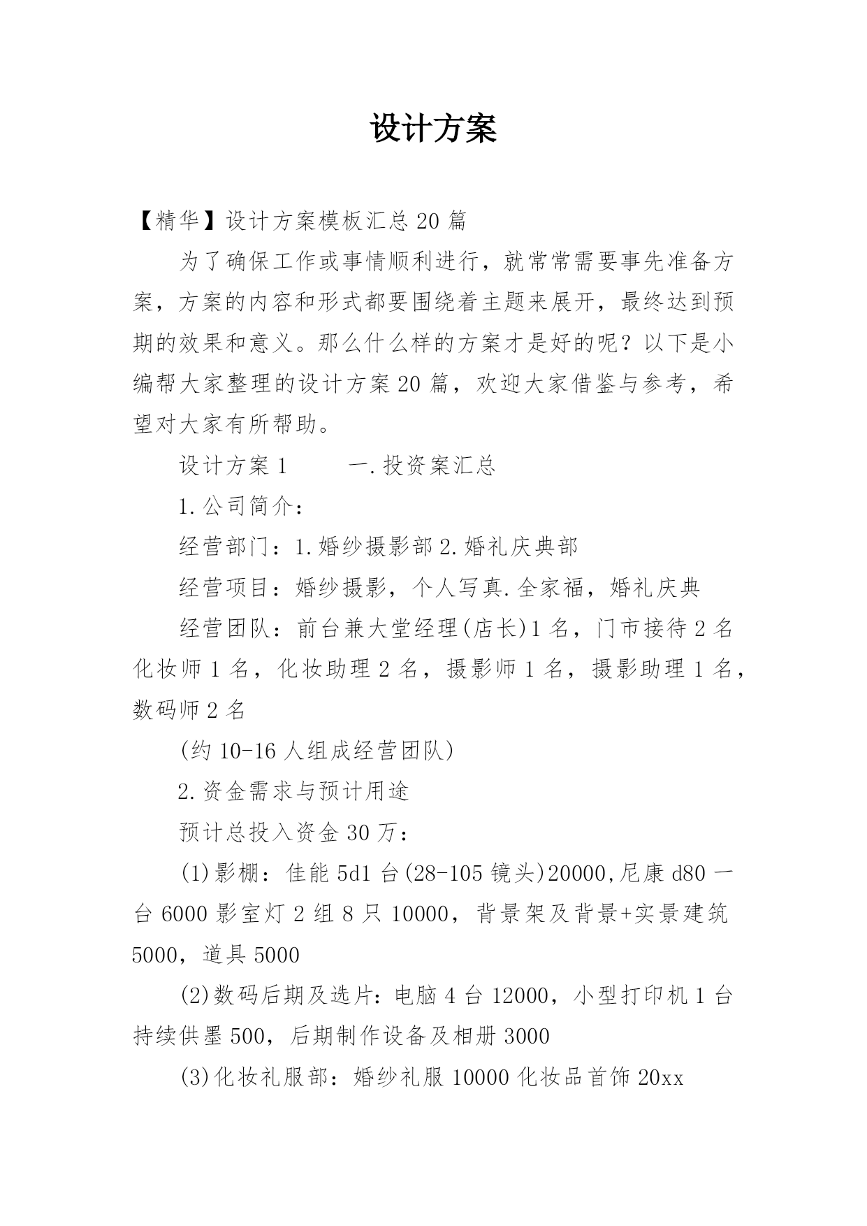设计方案【精华】设计方案模板汇总20篇为了确保工作或事情顺利进行,就常常需要事先准备方案,方案的内容和形式都要围绕着主题来展开,最终达到预期的效果和意义。那么什么样的方案才是好的呢?以下是小编帮大家整理的设计方案20篇,欢迎大家借鉴与参考,希望对大家有所帮助。设计方案1一.投资案汇总1.公司简介:经营部门:1.婚纱摄影部2.婚礼庆典部经营项目:婚纱摄影,个人写真.全家福,婚礼庆典经营团队:前台兼大堂经理(店长)1名,门市接待2名化妆师1名,化妆助理2名,摄影师1名,摄影助理1名,数码师2名(约10-16人