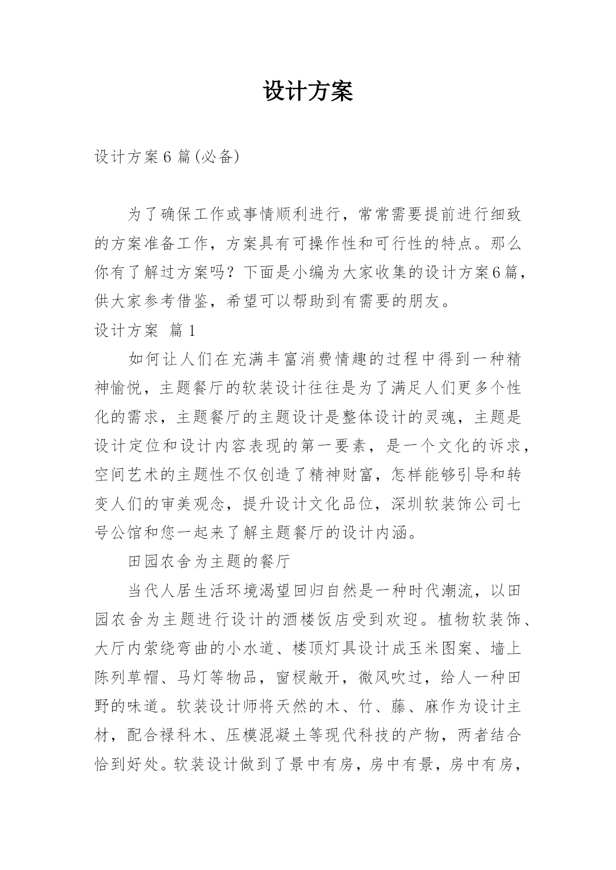 设计方案设计方案6篇(必备)为了确保工作或事情顺利进行,常常需要提前进行细致的方案准备工作,方案具有可操作性和可行性的特点。那么你有了解过方案吗?下面是小编为大家收集的设计方案6篇,供大家参考借鉴,希望可以帮助到有需要的朋友。设计方案篇1如何让人们在充满丰富消费情趣的过程中得到一种精神愉悦,主题餐厅的软装设计往往是为了满足人们更多个性化的需求,主题餐厅的主题设计是整体设计的灵魂,主题是设计定位和设计内容表现的第一要素,是一个文化的诉求,空间艺术的主题性不仅创造了精神财富,怎样能够引导和转变人们的审美观念,
