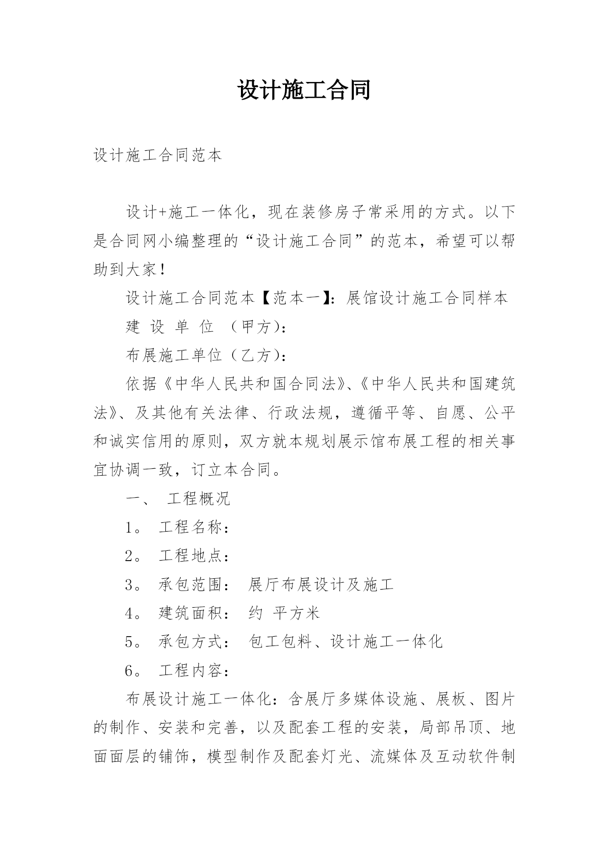 设计施工合同设计施工合同范本设计+施工一体化,现在装修房子常采用的方式。以下是合同网小编整理的“设计施工合同”的范本,希望可以帮助到大家!设计施工合同范本【范本一】:展馆设计施工合同样本建设单位(甲方):布展施工单位(乙方):依据《中华人民共和国合同法》、《中华人民共和国建筑法》、及其他有关法律、行政法规,遵循平等、自愿、公平和诚实信用的原则,双方就本规划展示馆布展工程的相关事宜协调一致,订立本合同。一、工程概况1。工程名称:2。工程地点:3。承包范围:展厅布展设计及施工4。建筑面积:约平方米5。承包方式