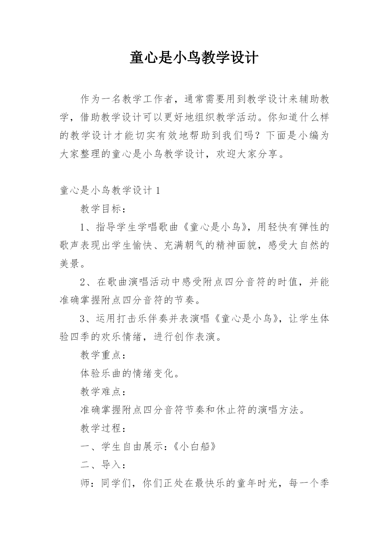 童心是小鸟教学设计作为一名教学工作者,通常需要用到教学设计来辅助教学,借助教学设计可以更好地组织教学活动。你知道什么样的教学设计才能切实有效地帮助到我们吗?下面是小编为大家整理的童心是小鸟教学设计,欢迎大家分享。童心是小鸟教学设计1教学目标:1、指导学生学唱歌曲《童心是小鸟》,用轻快有弹性的歌声表现出学生愉快、充满朝气的精神面貌,感受大自然的美景。2、在歌曲演唱活动中感受附点四分音符的时值,并能准确掌握附点四分音符的节奏。3、运用打击乐伴奏并表演唱《童心是小鸟》,让学生体验四季的欢乐情绪,进行创作表演。教