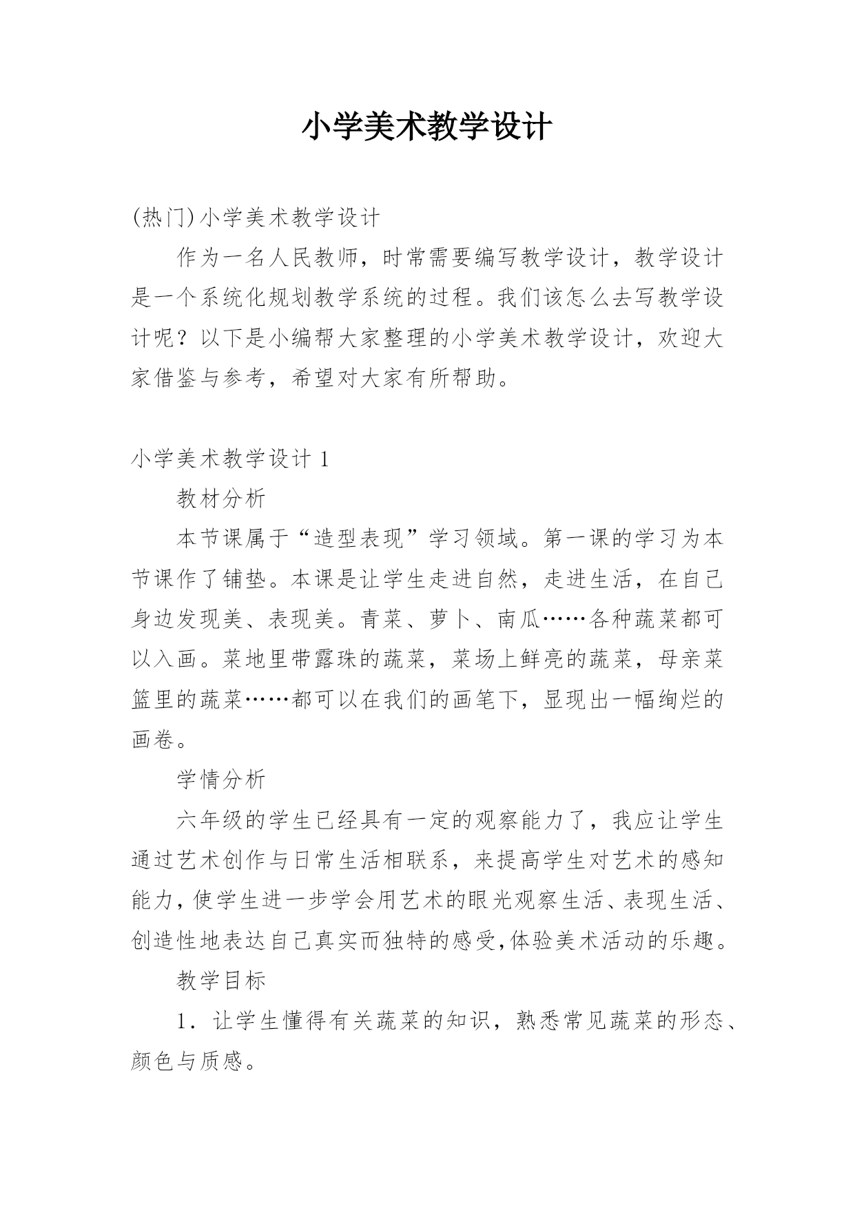 小学美术教学设计(热门)小学美术教学设计作为一名人民教师,时常需要编写教学设计,教学设计是一个系统化规划教学系统的过程。我们该怎么去写教学设计呢?以下是小编帮大家整理的小学美术教学设计,欢迎大家借鉴与参考,希望对大家有所帮助。小学美术教学设计1教材分析本节课属于“造型表现”学习领域。第一课的学习为本节课作了铺垫。本课是让学生走进自然,走进生活,在自己身边发现美、表现美。青菜、萝卜、南瓜……各种蔬菜都可以入画。菜地里带露珠的蔬菜,菜场上鲜亮的蔬菜,母亲菜篮里的蔬菜……都可以在我们的画笔下,显现出一幅绚烂的画