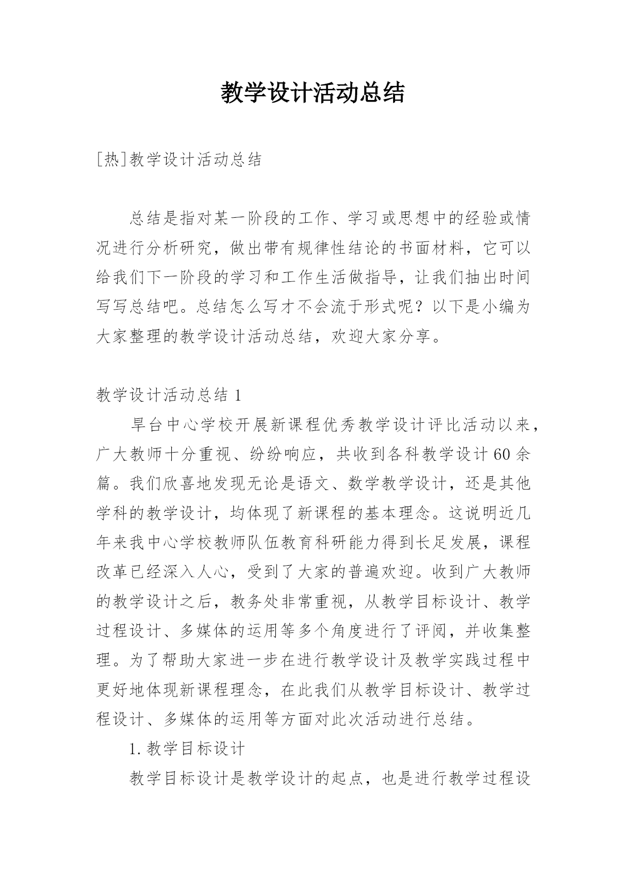 教学设计活动总结[热]教学设计活动总结总结是指对某一阶段的工作、学习或思想中的经验或情况进行分析研究,做出带有规律性结论的书面材料,它可以给我们下一阶段的学习和工作生活做指导,让我们抽出时间写写总结吧。总结怎么写才不会流于形式呢?以下是小编为大家整理的教学设计活动总结,欢迎大家分享。教学设计活动总结1旱台中心学校开展新课程优秀教学设计评比活动以来,广大教师十分重视、纷纷响应,共收到各科教学设计60余篇。我们欣喜地发现无论是语文、数学教学设计,还是其他学科的教学设计,均体现了新课程的基本理念。这说明近几年来