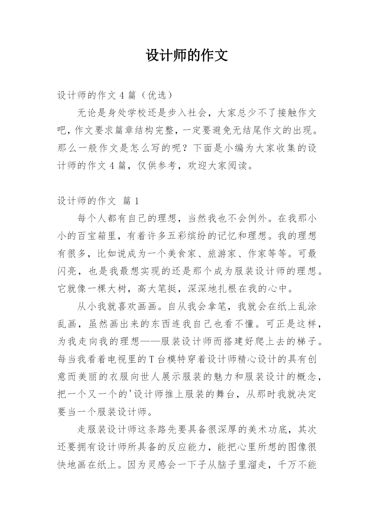 设计师的作文设计师的作文4篇(优选)无论是身处学校还是步入社会,大家总少不了接触作文吧,作文要求篇章结构完整,一定要避免无结尾作文的出现。那么一般作文是怎么写的呢?下面是小编为大家收集的设计师的作文4篇,仅供参考,欢迎大家阅读。设计师的作文篇1每个人都有自己的理想,当然我也不会例外。在我那小小的百宝箱里,有着许多五彩缤纷的记忆和理想。我的理想有很多,比如说成为一个美食家、旅游家、作家等等。可最闪亮,也是我最想实现的还是那个成为服装设计师的理想。它就像一棵大树,高大笔挺,深深地扎根在我的心中。从小我就喜欢画