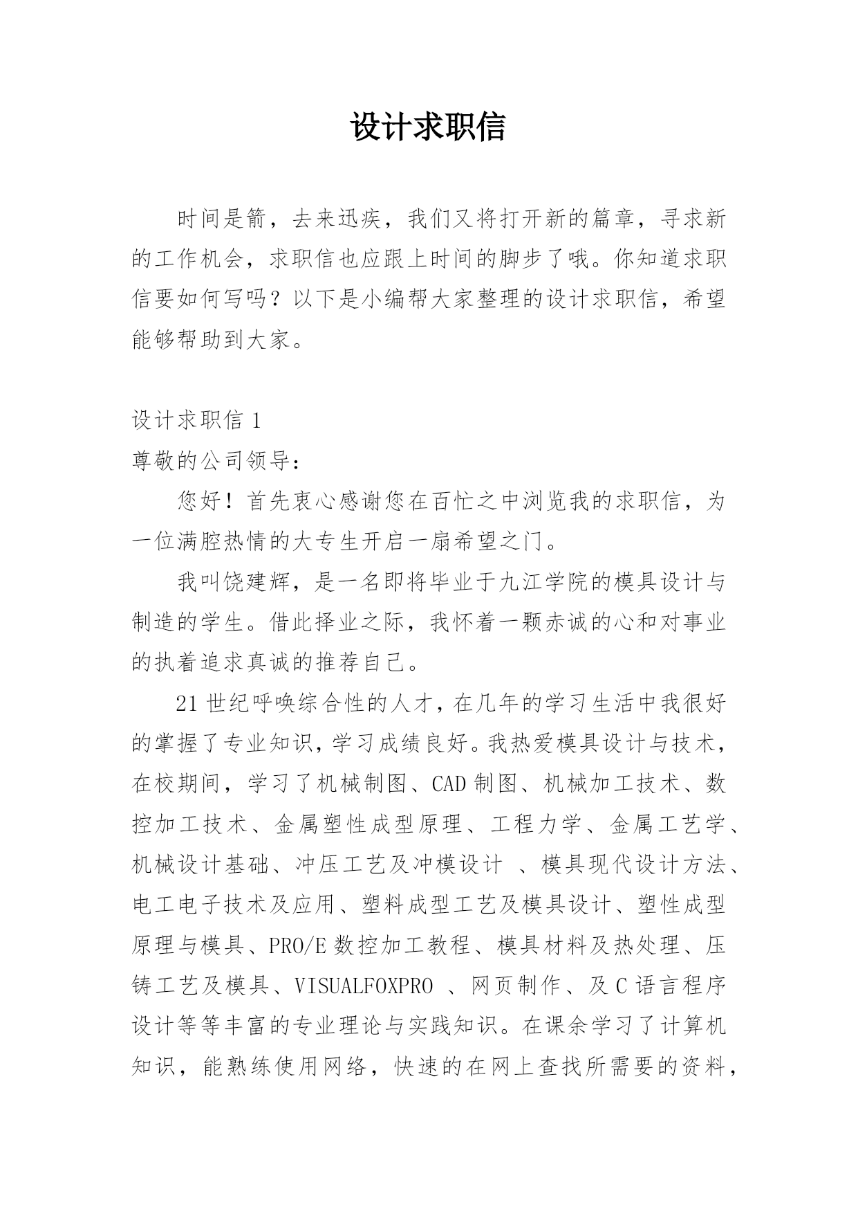 设计求职信时间是箭,去来迅疾,我们又将打开新的篇章,寻求新的工作机会,求职信也应跟上时间的脚步了哦。你知道求职信要如何写吗?以下是小编帮大家整理的设计求职信,希望能够帮助到大家。设计求职信1尊敬的公司领导:您好!首先衷心感谢您在百忙之中浏览我的求职信,为一位满腔热情的大专生开启一扇希望之门。我叫饶建辉,是一名即将毕业于九江学院的模具设计与制造的学生。借此择业之际,我怀着一颗赤诚的心和对事业的执着追求真诚的推荐自己。21世纪呼唤综合性的人才,在几年的学习生活中我很好的掌握了专业知识,学习成绩良好。我热爱模具