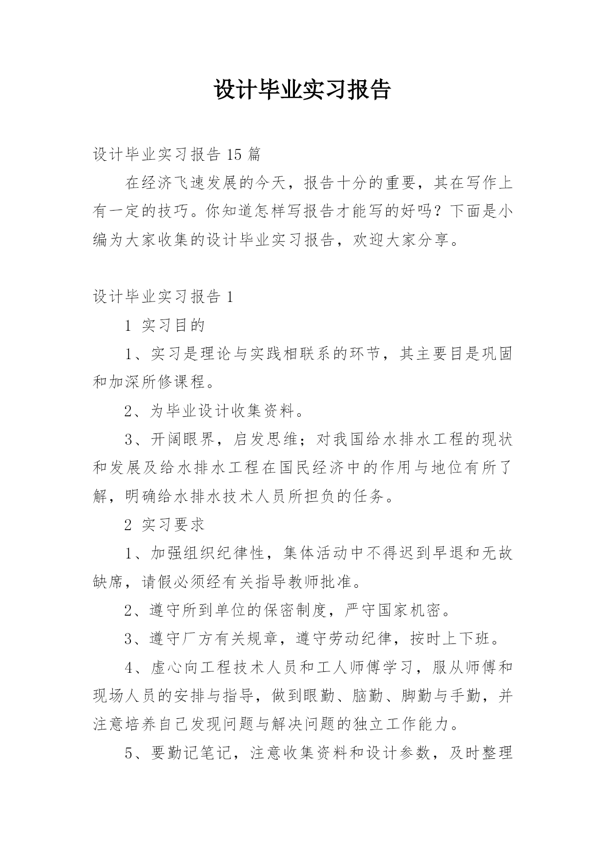 设计毕业实习报告设计毕业实习报告15篇在经济飞速发展的今天,报告十分的重要,其在写作上有一定的技巧。你知道怎样写报告才能写的好吗?下面是小编为大家收集的设计毕业实习报告,欢迎大家分享。设计毕业实习报告11实习目的1、实习是理论与实践相联系的环节,其主要目是巩固和加深所修课程。2、为毕业设计收集资料。3、开阔眼界,启发思维;对我国给水排水工程的现状和发展及给水排水工程在国民经济中的作用与地位有所了解,明确给水排水技术人员所担负的任务。2实习要求1、加强组织纪律性,集体活动中不得迟到早退和无故缺席,请假必须经