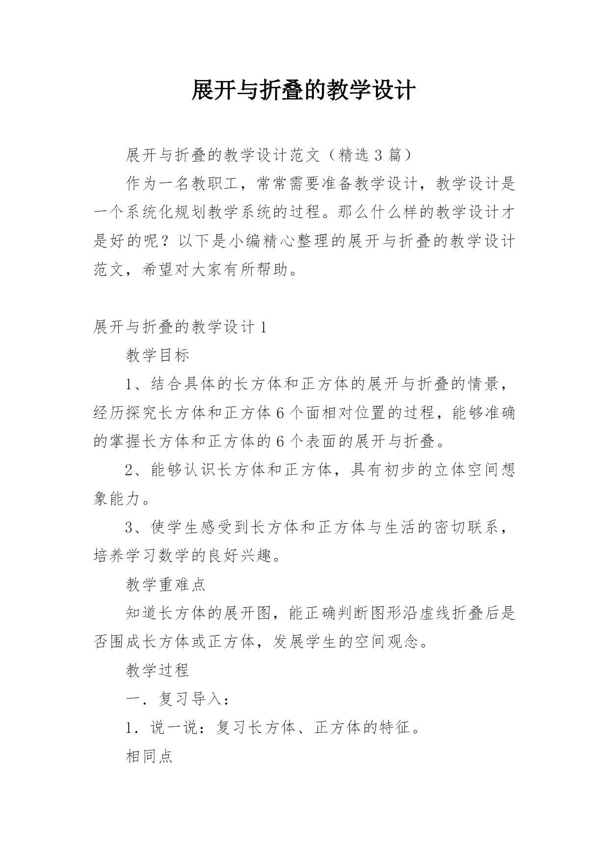 展开与折叠的教学设计展开与折叠的教学设计范文(精选3篇)作为一名教职工,常常需要准备教学设计,教学设计是一个系统化规划教学系统的过程。那么什么样的教学设计才是好的呢?以下是小编精心整理的展开与折叠的教学设计范文,希望对大家有所帮助。展开与折叠的教学设计1教学目标1、结合具体的长方体和正方体的展开与折叠的情景,经历探究长方体和正方体6个面相对位置的过程,能够准确的掌握长方体和正方体的6个表面的展开与折叠。2、能够认识长方体和正方体,具有初步的立体空间想象能力。3、使学生感受到长方体和正方体与生活的密切联系,