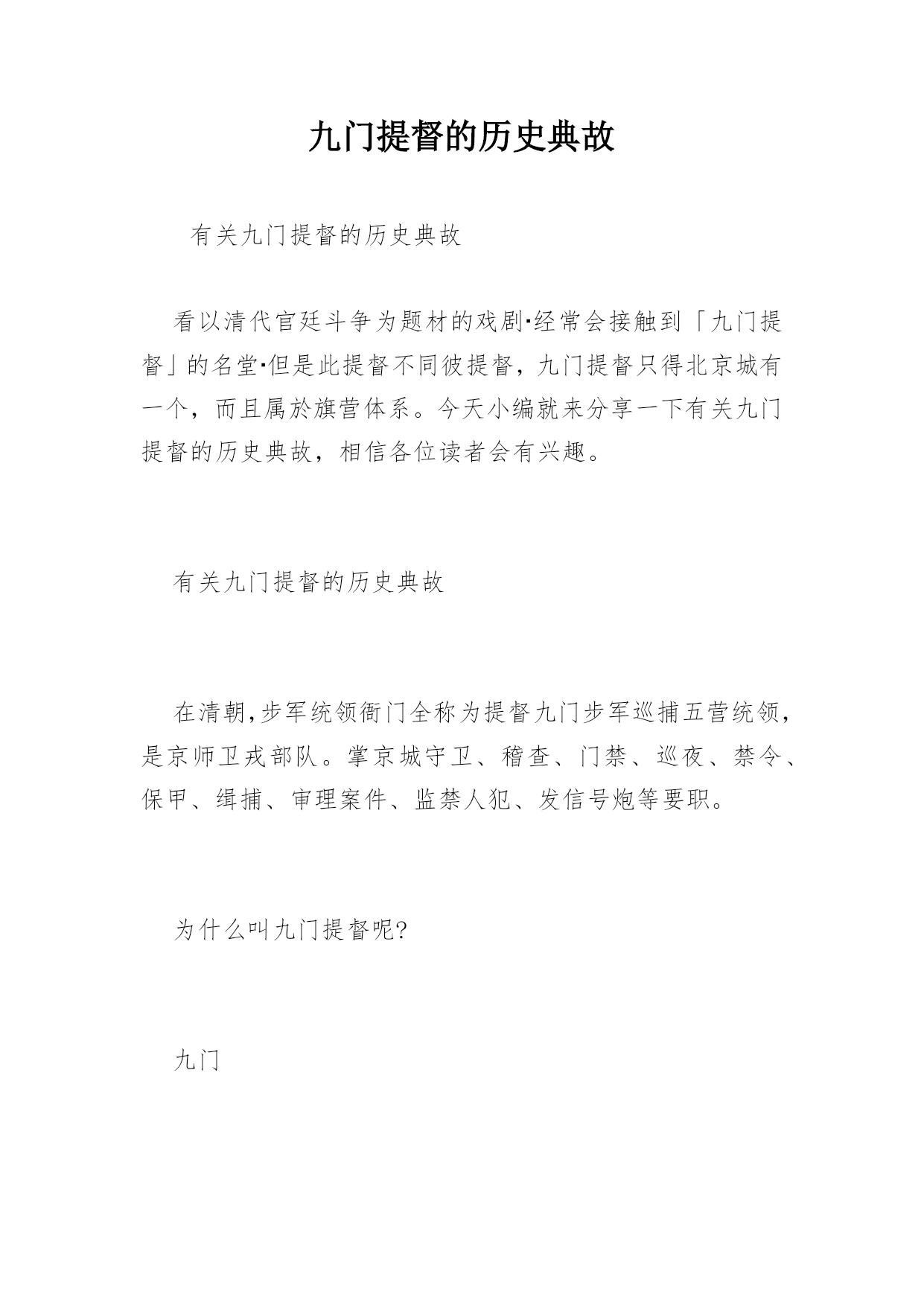 九门提督的历史典故有关九门提督的历史典故看以清代官廷斗争为题材的戏剧‧经常会接触到「九门提督」的名堂‧但是此提督不同彼提督,九门提督只得北京城有一个,而且属於旗营体系。今天小编就来分享一下有关九门提督的历史典故,相信各位读者会有兴趣。有关九门提督的历史典故在清朝,步军统领衙门全称为提督九门步军巡捕五营统领,是京师卫戎部队。掌京城守卫、稽查、门禁、巡夜、禁令、保甲、缉捕、审理案件、监禁人犯、发信号炮等要职。为什么叫九门提督呢?九门九门指的是东边的东直门、朝阳门;西边的西直门和阜成门;北边的德胜门、安定门;南