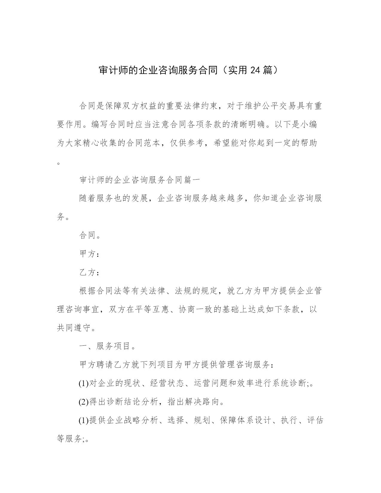 审计师的企业咨询服务合同(实用24篇)合同是保障双方权益的重要法律约束,对于维护公平交易具有重要作用。编写合同时应当注意合同各项条款的清晰明确。以下是小编为大家精心收集的合同范本,仅供参考,希望能对你起到一定的帮助。审计师的企业咨询服务合同篇一随着服务也的发展,企业咨询服务越来越多,你知道企业咨询服务。合同。甲方:乙方:根据合同法等有关法律、法规的规定,就乙方为甲方提供企业管理咨询事宜,双方在平等互惠、协商一致的基础上达成如下条款,以共同遵守。一、服务项目。甲方聘请乙方就下列项目为甲方提供管理咨询服务:(