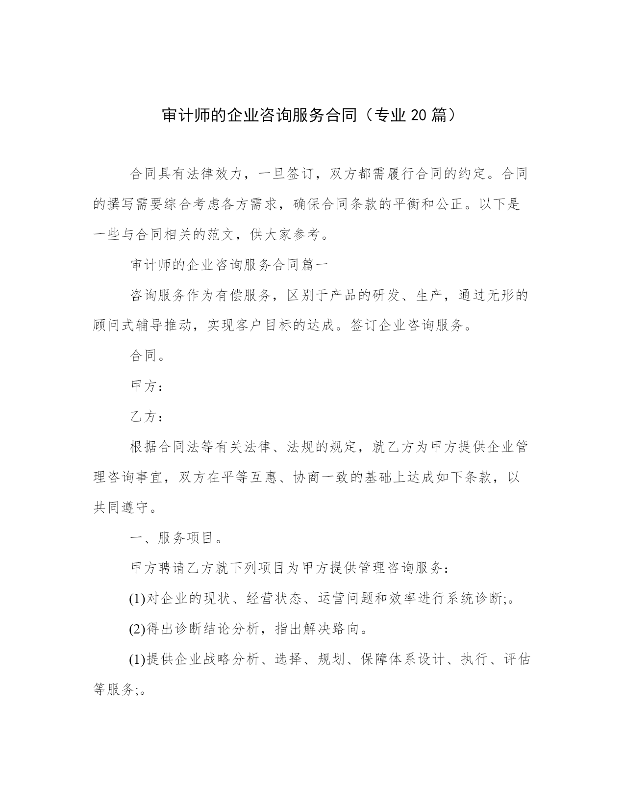 审计师的企业咨询服务合同(专业20篇)合同具有法律效力,一旦签订,双方都需履行合同的约定。合同的撰写需要综合考虑各方需求,确保合同条款的平衡和公正。以下是一些与合同相关的范文,供大家参考。审计师的企业咨询服务合同篇一咨询服务作为有偿服务,区别于产品的研发、生产,通过无形的顾问式辅导推动,实现客户目标的达成。签订企业咨询服务。合同。甲方:乙方:根据合同法等有关法律、法规的规定,就乙方为甲方提供企业管理咨询事宜,双方在平等互惠、协商一致的基础上达成如下条款,以共同遵守。一、服务项目。甲方聘请乙方就下列项目为甲