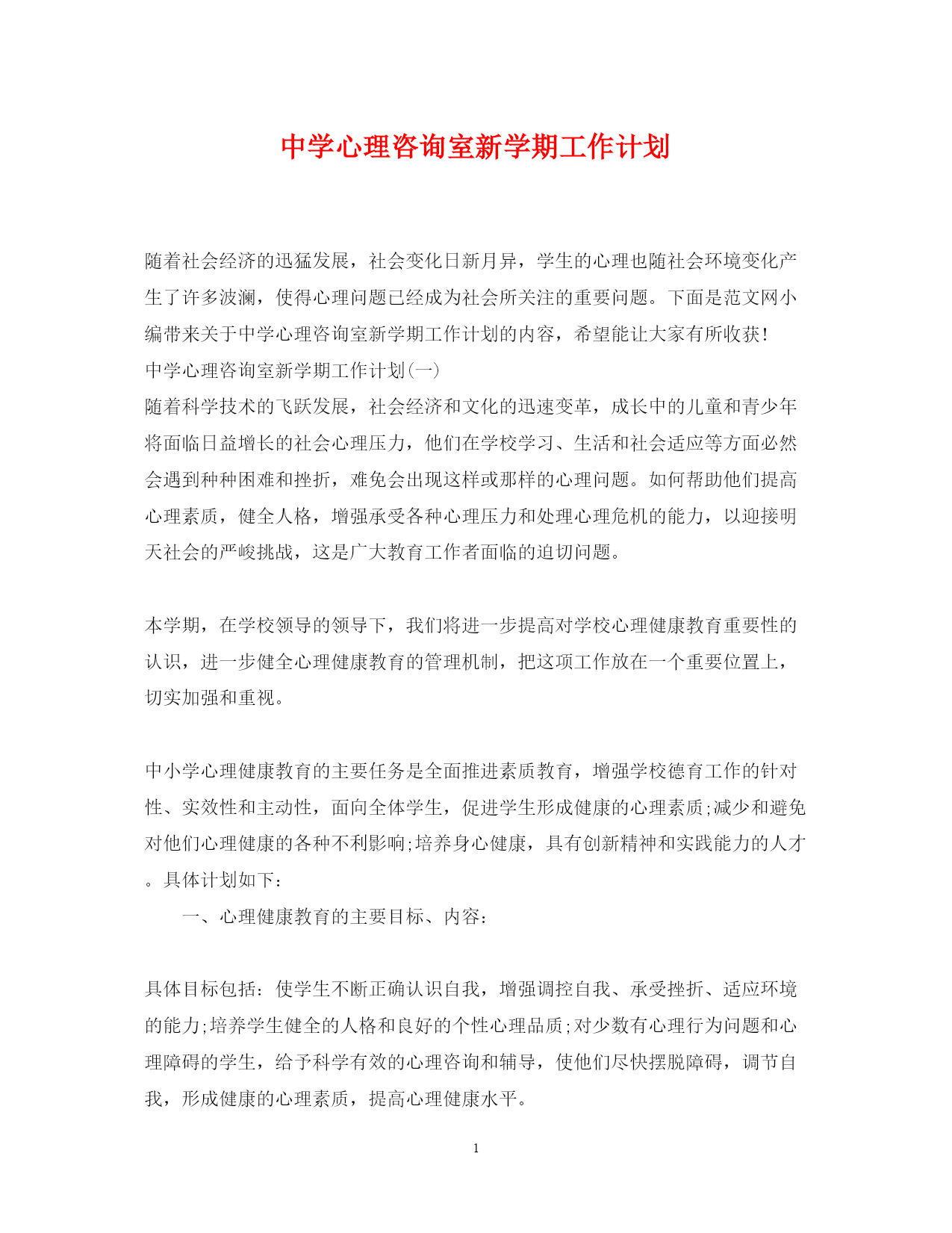 此资料由网络收集而来,如有侵权请告知上传者立即删除。资料共分享,我们负责传递知识。PAGEPAGE11中学心理咨询室新学期工作计划随着社会经济的迅猛发展,社会变化日新月异,学生的心理也随社会环境变化产生了许多波澜,使得心理问题已经成为社会所关注的重要问题。下面是范文网小编带来关于中学心理咨询室新学期工作计划的内容,希望能让大家有所收获!中学心理咨询室新学期工作计划(一)随着科学技术的飞跃发展,社会经济和文化的迅速变革,成长中的儿童和青少年将面临日益增长的社会心理压力,他们在学校学习、生活和社会