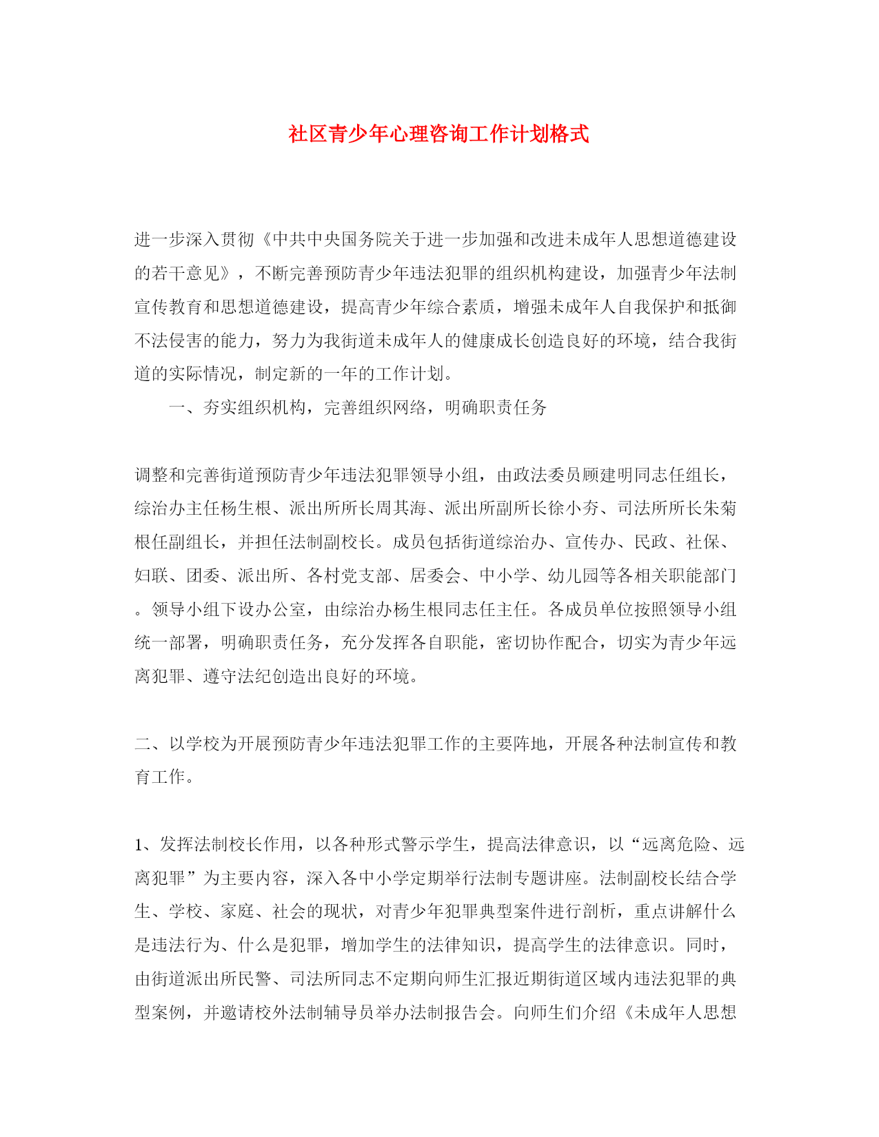 此资料由网络收集而来,如有侵权请告知上传者立即删除。资料共分享,我们负责传递知识。社区青少年心理咨询工作计划格式进一步深入贯彻《中共中央国务院关于进一步加强和改进未成年人思想道德建设的若干意见》,不断完善预防青少年违法犯罪的组织机构建设,加强青少年法制宣传教育和思想道德建设,提高青少年综合素质,增强未成年人自我保护和抵御不法侵害的能力,努力为我街道未成年人的健康成长创造良好的环境,结合我街道的实际情况,制定新的一年的工作计划。一、夯实组织机构,完善组织网络,明确职责任务调整和完善街道预防青少年违法犯罪领导