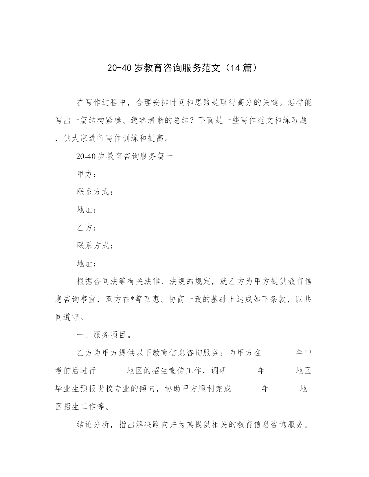 20-40岁教育咨询服务范文(14篇)在写作过程中,合理安排时间和思路是取得高分的关键。怎样能写出一篇结构紧凑、逻辑清晰的总结?下面是一些写作范文和练习题,供大家进行写作训练和提高。20-40岁教育咨询服务篇一甲方:联系方式:地址:乙方:联系方式:地址:根据合同法等有关法律、法规的规定,就乙方为甲方提供教育信息咨询事宜,双方在*等互惠、协商一致的基础上达成如下条款,以共同遵守。一、服务项目。乙方为甲方提供以下教育信息咨询服务:为甲方在________年中考前后进行_______地区的招生宣传工作,调研__