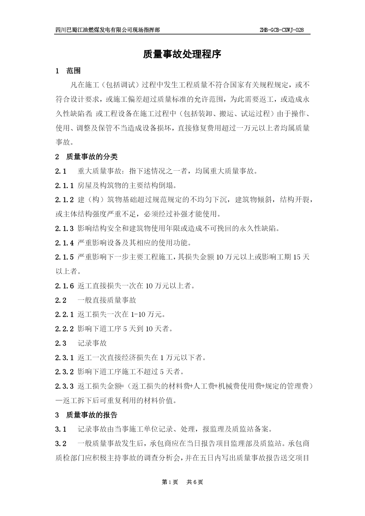 四川巴蜀江油燃煤发电有限公司现场指挥部ZHB-GCB-CXWJ-028第PAGE6页质量事故处理程序范围凡在施工(包括调试)过程中发生工程质量不符合国家有关规程规定,或不符合设计要求,或施工偏差超过质量标准的允许范围,为此需要返工,或造成永久性缺陷者;或工程设备在施工过程中(包括装卸、搬运、试运过程)由于操作、使用、调整及保管不当造成设备损坏,直接修复费用超过一万元以上者均属质量事故。质量事故的分类重大质量事故:指下述情况之一者,均属重大质量事故。房屋及构筑物的主要结构倒塌。建(构)筑物基础超过规范