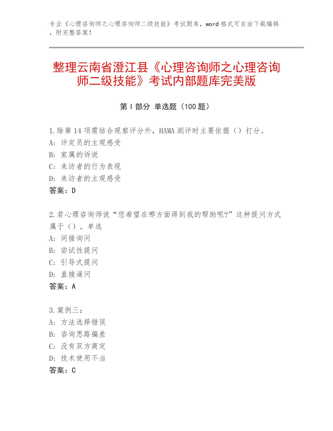 整理云南省澄江县《心理咨询师之心理咨询师二级技能》考试内部题库完美版.docx