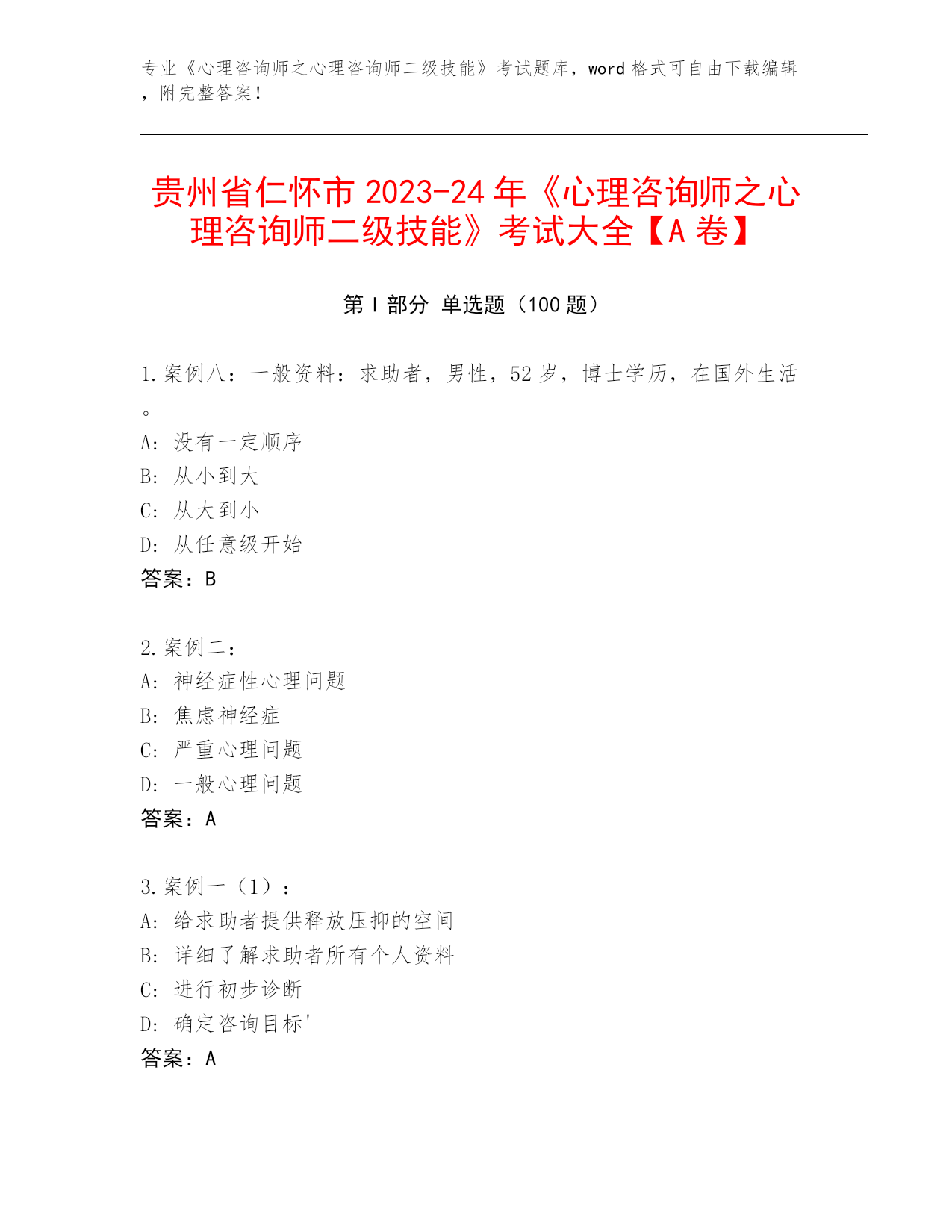 专业《心理咨询师之心理咨询师二级技能》考试题库,word格式可自由下载编辑,附完整答案!贵州省仁怀市2023-24年《心理咨询师之心理咨询师二级技能》考试大全【A卷】第I部分单选题(100题)1.案例八:一般资料:求助者,男性,52岁,博士学历,在国外生活。A:没有一定顺序B:从小到大C:从大到小D:从任意级开始答案:B2.案例二:A:神经症性心理问题B:焦虑神经症C:严重心理问题D:一般心理问题答案:A3.案例一(1):A:给求助者提供释放压抑的空间B:详细了解求助者所有个人资料C:进行初步诊断D:确定