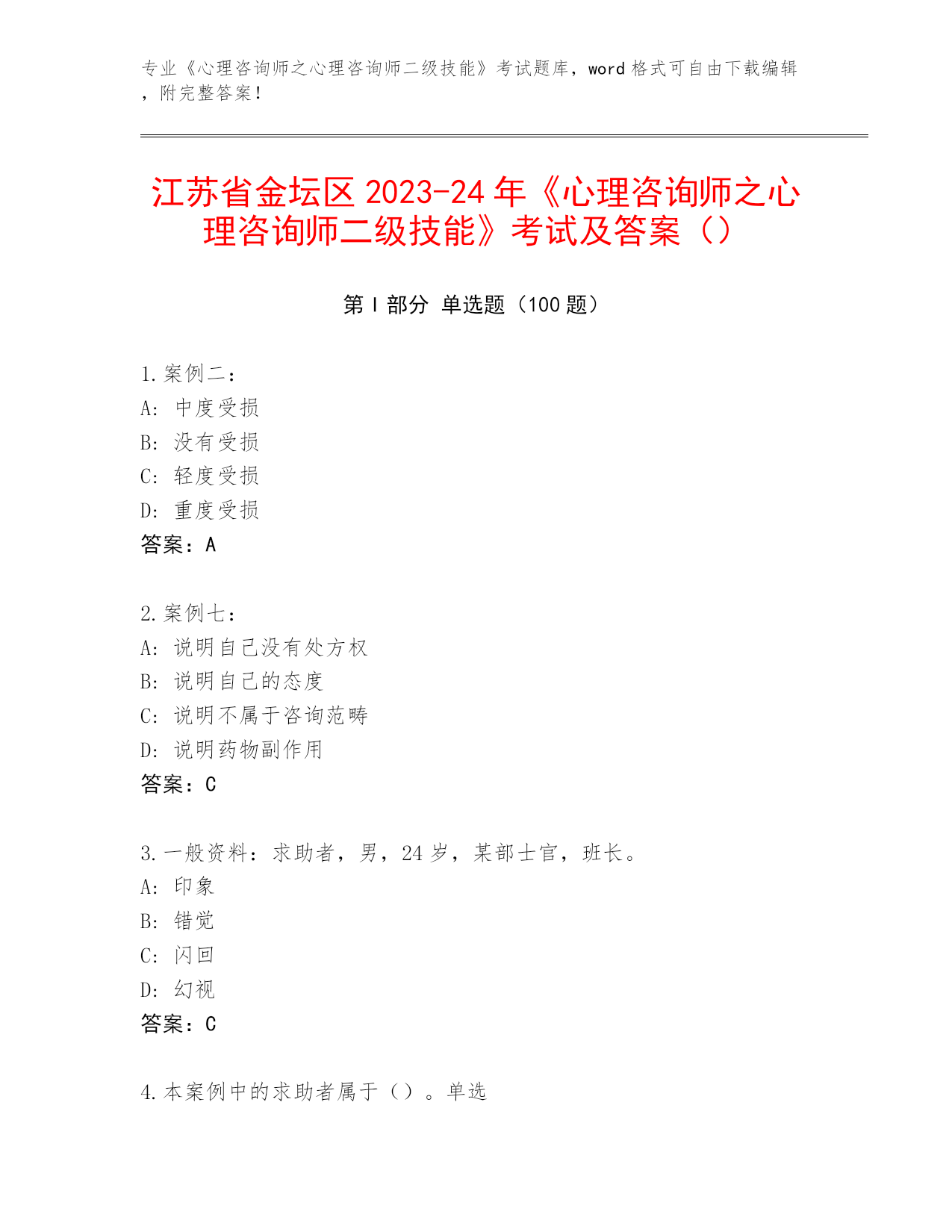 专业《心理咨询师之心理咨询师二级技能》考试题库,word格式可自由下载编辑,附完整答案!江苏省金坛区2023-24年《心理咨询师之心理咨询师二级技能》考试及答案()第I部分单选题(100题)1.案例二:A:中度受损B:没有受损C:轻度受损D:重度受损答案:A2.案例七:A:说明自己没有处方权B:说明自己的态度C:说明不属于咨询范畴D:说明药物副作用答案:C3.一般资料:求助者,男,24岁,某部士官,班长。A:印象B:错觉C:闪回D:幻视答案:C4.本案例中的求助者属于()。单选A:心理正常B:心理不正常C