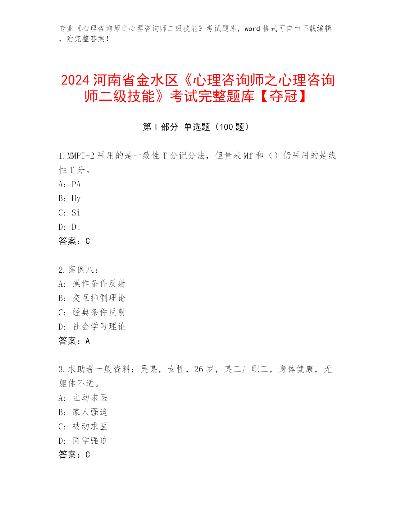 专业《心理咨询师之心理咨询师二级技能》资格考试题库,word格式可自由下载编辑,附完整答案!广西壮族自治区2024《心理咨询师之心理咨询师二级技能》资格考试【名校卷】第I部分单选题(100题)1.求助者,女性,37岁,会计。A:顺从B:阻抗C:依赖D:移情答案:C2.一般资料:求助者,女,25岁,未婚,中学教师,经济状况良好。A:内心恐惧和焦虑B:情绪反应比较强烈C:内心痛苦无法摆脱D:是现实和道德冲突答案:A3.案例六:A:语义分析B:产婆术式辩论C:认知重组D:自我管理程序答案:B4.案例五A:变形B