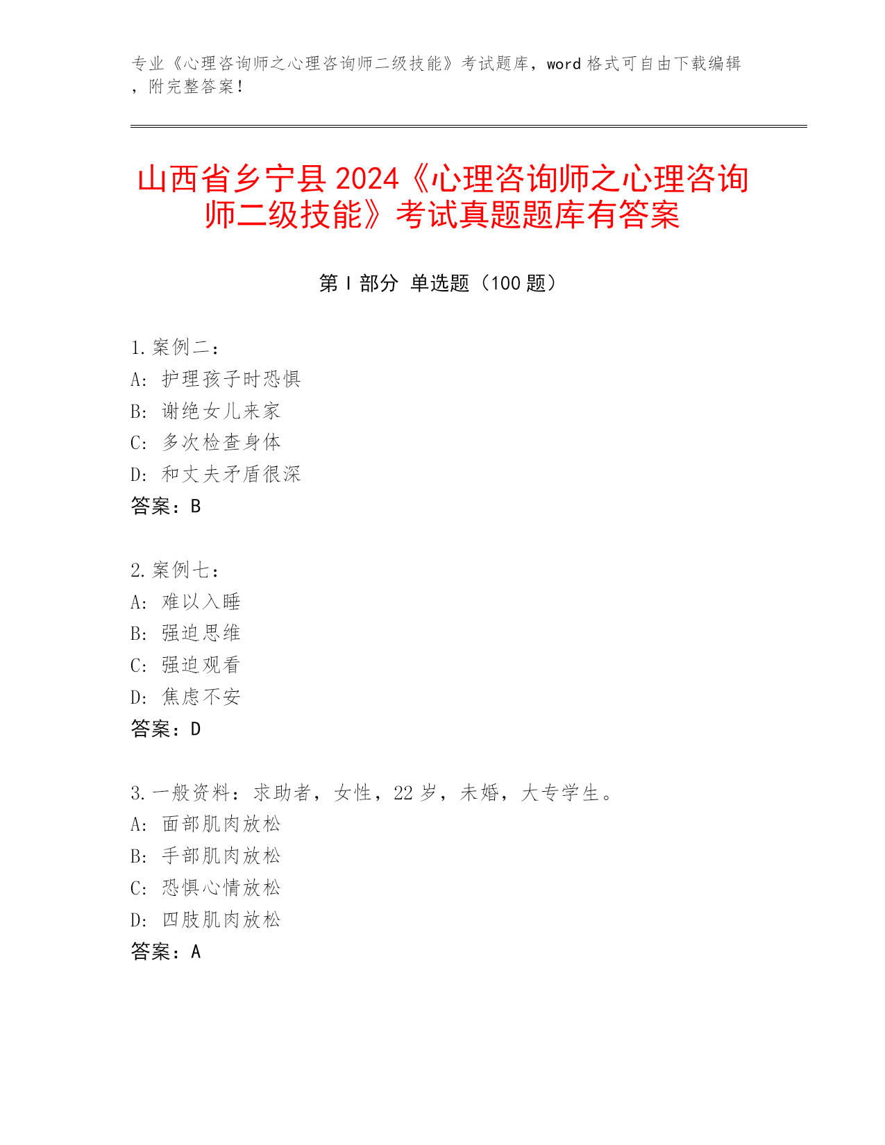 专业《心理咨询师之心理咨询师二级技能》考试题库,word格式可自由下载编辑,附完整答案!山西省乡宁县2024《心理咨询师之心理咨询师二级技能》考试真题题库有答案第I部分单选题(100题)1.案例二:A:护理孩子时恐惧B:谢绝女儿来家C:多次检查身体D:和丈夫矛盾很深答案:B2.案例七:A:难以入睡B:强迫思维C:强迫观看D:焦虑不安答案:D3.一般资料:求助者,女性,22岁,未婚,大专学生。A:面部肌肉放松B:手部肌肉放松C:恐惧心情放松D:四肢肌肉放松答案:A4.求助者一般资料:敏儿,23岁,女性,公司