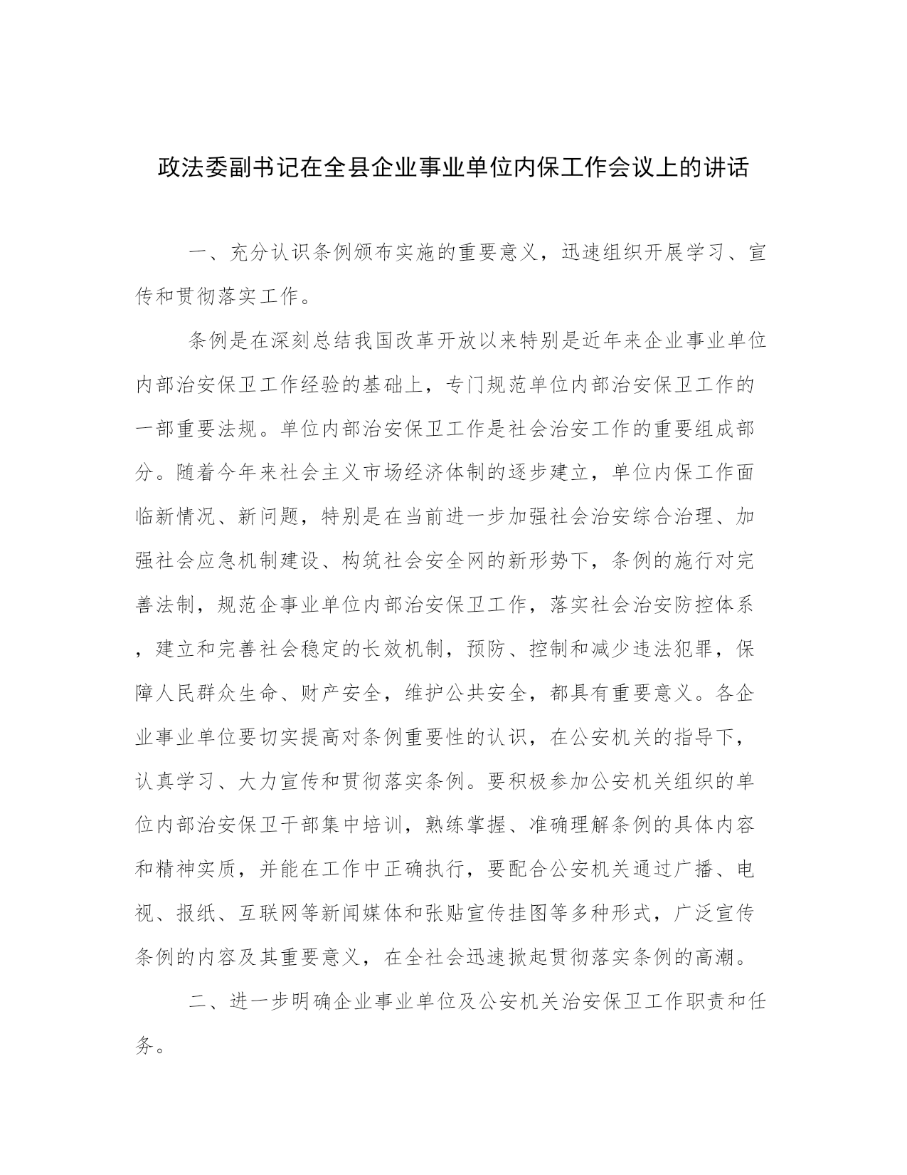 政法委副书记在全县企业事业单位内保工作会议上的讲话一、充分认识条例颁布实施的重要意义,迅速组织开展学习、宣传和贯彻落实工作。条例是在深刻总结我国改革开放以来特别是近年来企业事业单位内部治安保卫工作经验的基础上,专门规范单位内部治安保卫工作的一部重要法规。单位内部治安保卫工作是社会治安工作的重要组成部分。随着今年来社会主义市场经济体制的逐步建立,单位内保工作面临新情况、新问题,特别是在当前进一步加强社会治安综合治理、加强社会应急机制建设、构筑社会安全网的新形势下,条例的施行对完善法制,规范企事业单位内部治安