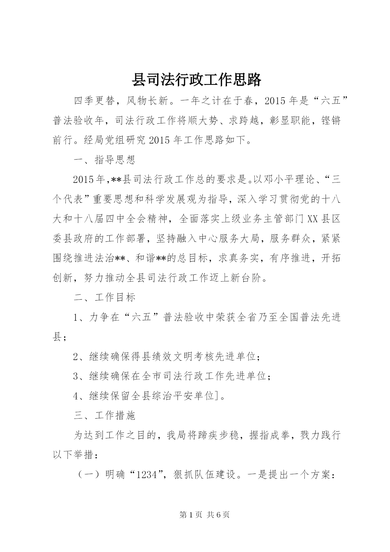 第PAGE\*Arabic\*MERGEFORMAT6页共NUMPAGES\*MERGEFORMAT6页县司法行政工作思路四季更替,风物长新。一年之计在于春,2015年是“六五”普法验收年,司法行政工作将顺大势、求跨越,彰显职能,铿锵前行。经局党组研究2015年工作思路如下。一、指导思想2015年,**县司法行政工作总的要求是。以邓小平理论、“三个代表”重要思想和科学发展观为指导,深入学习贯彻党的十八大和十八届四中全会精神,全面落实上级业务主管部门XX县区委县政府的工作部署,坚持融入中心服务大
