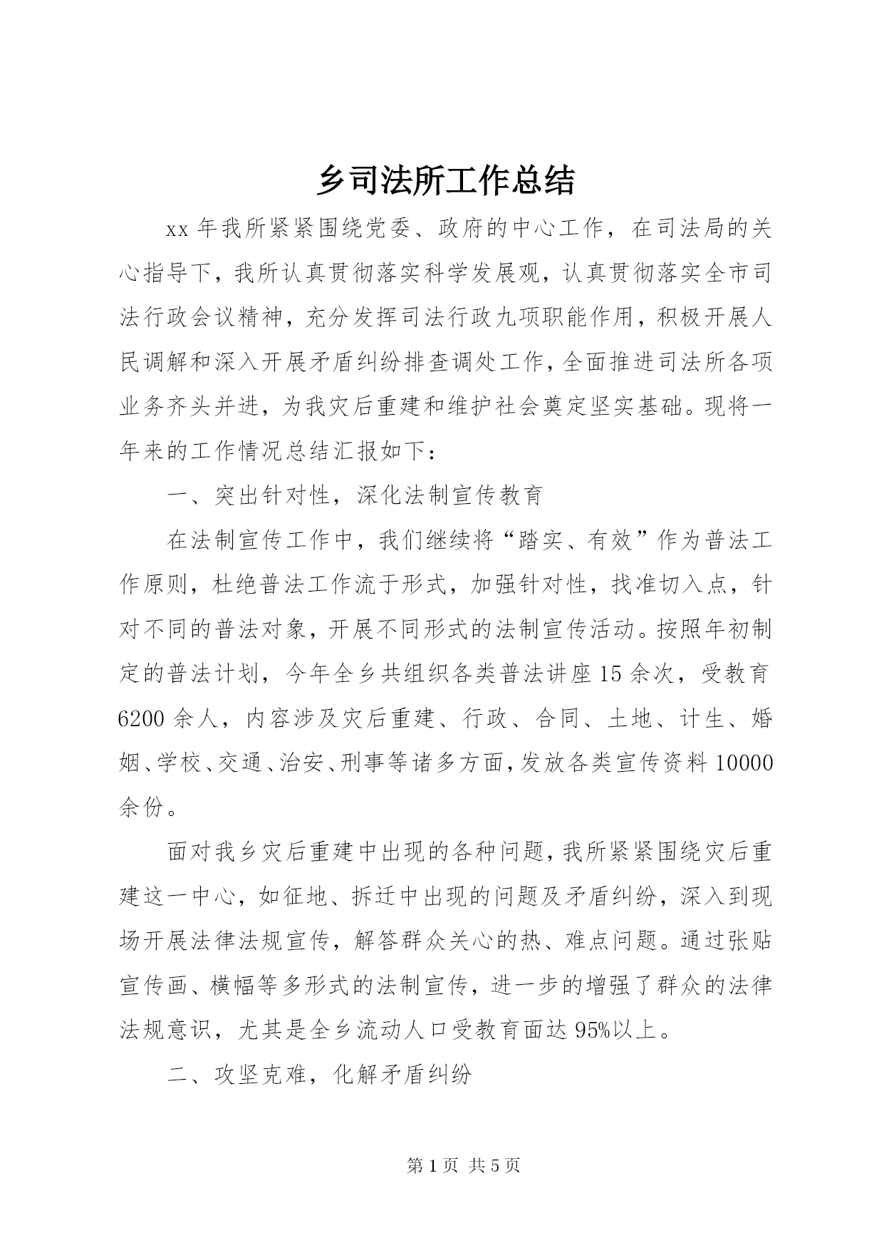 第PAGE\*Arabic\*MERGEFORMAT5页共NUMPAGES\*MERGEFORMAT5页乡司法所工作总结xx年我所紧紧围绕党委、政府的中心工作,在司法局的关心指导下,我所认真贯彻落实科学发展观,认真贯彻落实全市司法行政会议精神,充分发挥司法行政九项职能作用,积极开展人民调解和深入开展矛盾纠纷排查调处工作,全面推进司法所各项业务齐头并进,为我灾后重建和维护社会奠定坚实基础。现将一年来的工作情况总结汇报如下:一、突出针对性,深化法制宣传教育在法制宣传工作中,我们继续将“踏实、有效”
