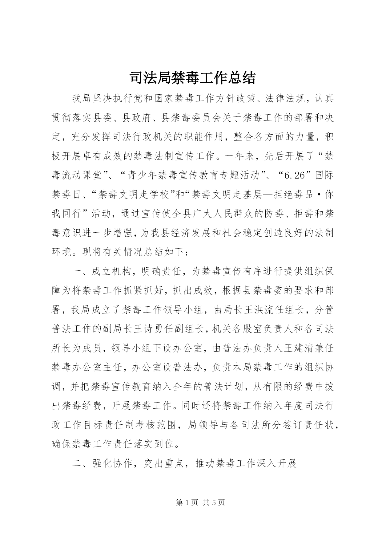第PAGE\*Arabic\*MERGEFORMAT5页共NUMPAGES\*MERGEFORMAT5页司法局禁毒工作总结我局坚决执行党和国家禁毒工作方针政策、法律法规,认真贯彻落实县委、县政府、县禁毒委员会关于禁毒工作的部署和决定,充分发挥司法行政机关的职能作用,整合各方面的力量,积极开展卓有成效的禁毒法制宣传工作。一年来,先后开展了“禁毒流动课堂”、“青少年禁毒宣传教育专题活动”、“6.26”国际禁毒日、“禁毒文明走学校”和“禁毒文明走基层—拒绝毒品·你我同行”活动,通过宣传使全县广大人民