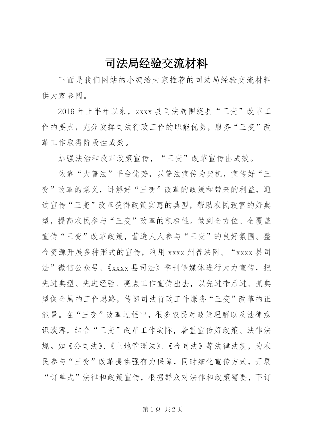 第PAGE\*Arabic\*MERGEFORMAT2页共NUMPAGES\*MERGEFORMAT2页司法局经验交流材料下面是我们网站的小编给大家推荐的司法局经验交流材料供大家参阅。2016年上半年以来,xxxx县司法局围绕县“三变”改革工作的要点,充分发挥司法行政工作的职能优势,服务“三变”改革工作取得阶段性成效。加强法治和改革政策宣传,“三变”改革宣传出成效。依靠“大普法”平台优势,以普法宣传为契机,宣传好“三变”改革的意义,讲解好“三变”改革的政策和带来的利益,通过宣传“三变”改革获得