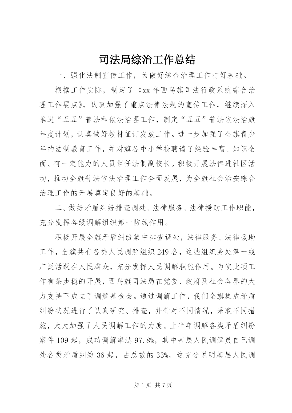 第PAGE\*Arabic\*MERGEFORMAT7页共NUMPAGES\*MERGEFORMAT7页司法局综治工作总结一、强化法制宣传工作,为做好综合治理工作打好基础。根据工作实际,制定了《xx年西乌旗司法行政系统综合治理工作要点》,认真加强了重点法律法规的宣传工作,继续深入推进“五五”普法和依法治理工作,制定“五五”普法依法治旗年度计划,认真做好教材征订发放工作。进一步加强了全旗青少年的法制教育工作,并对旗各中小学校聘请了经验丰富、知识全面、有一定能力的人员担任法制副校长。积极开展法律进