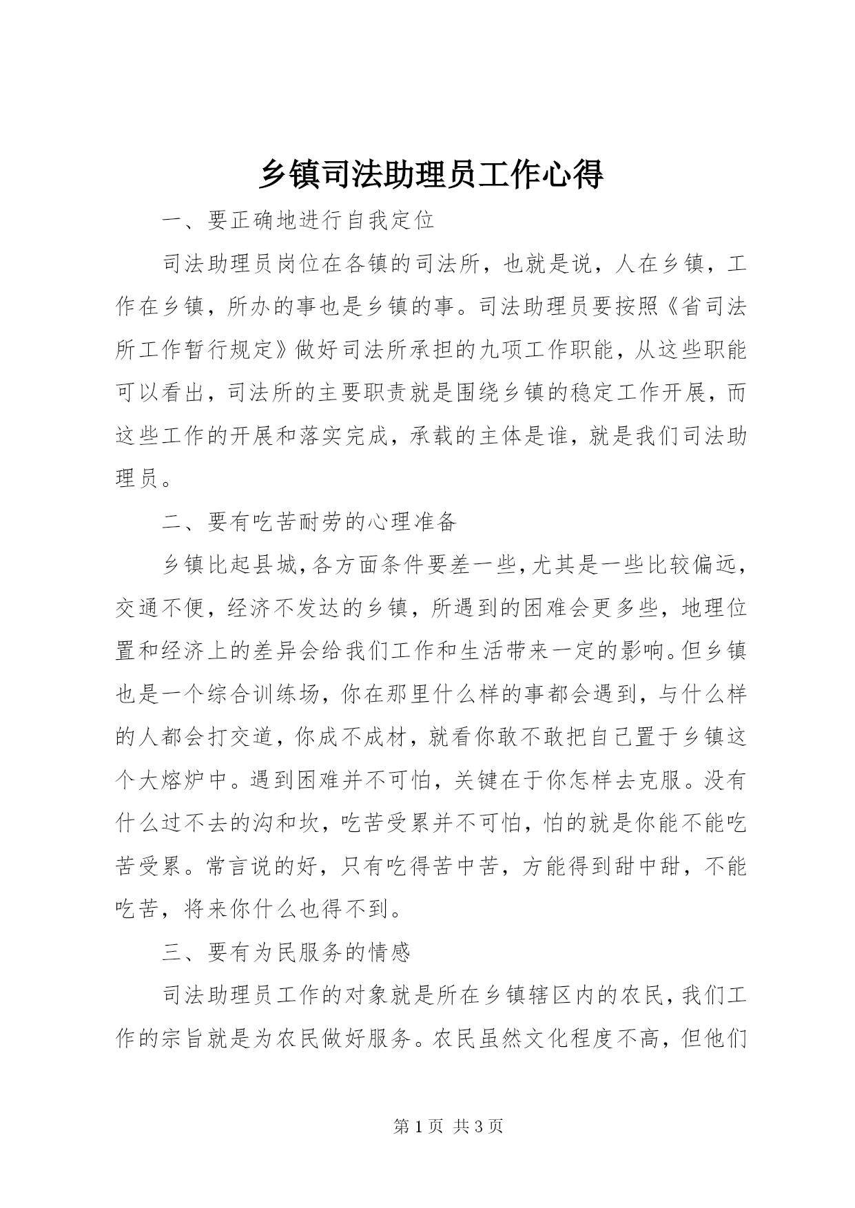 第PAGE\*Arabic\*MERGEFORMAT3页共NUMPAGES\*MERGEFORMAT3页乡镇司法助理员工作心得一、要正确地进行自我定位司法助理员岗位在各镇的司法所,也就是说,人在乡镇,工作在乡镇,所办的事也是乡镇的事。司法助理员要按照《省司法所工作暂行规定》做好司法所承担的九项工作职能,从这些职能可以看出,司法所的主要职责就是围绕乡镇的稳定工作开展,而这些工作的开展和落实完成,承载的主体是谁,就是我们司法助理员。二、要有吃苦耐劳的心理准备乡镇比起县城,各方面条件要差一些,尤其是