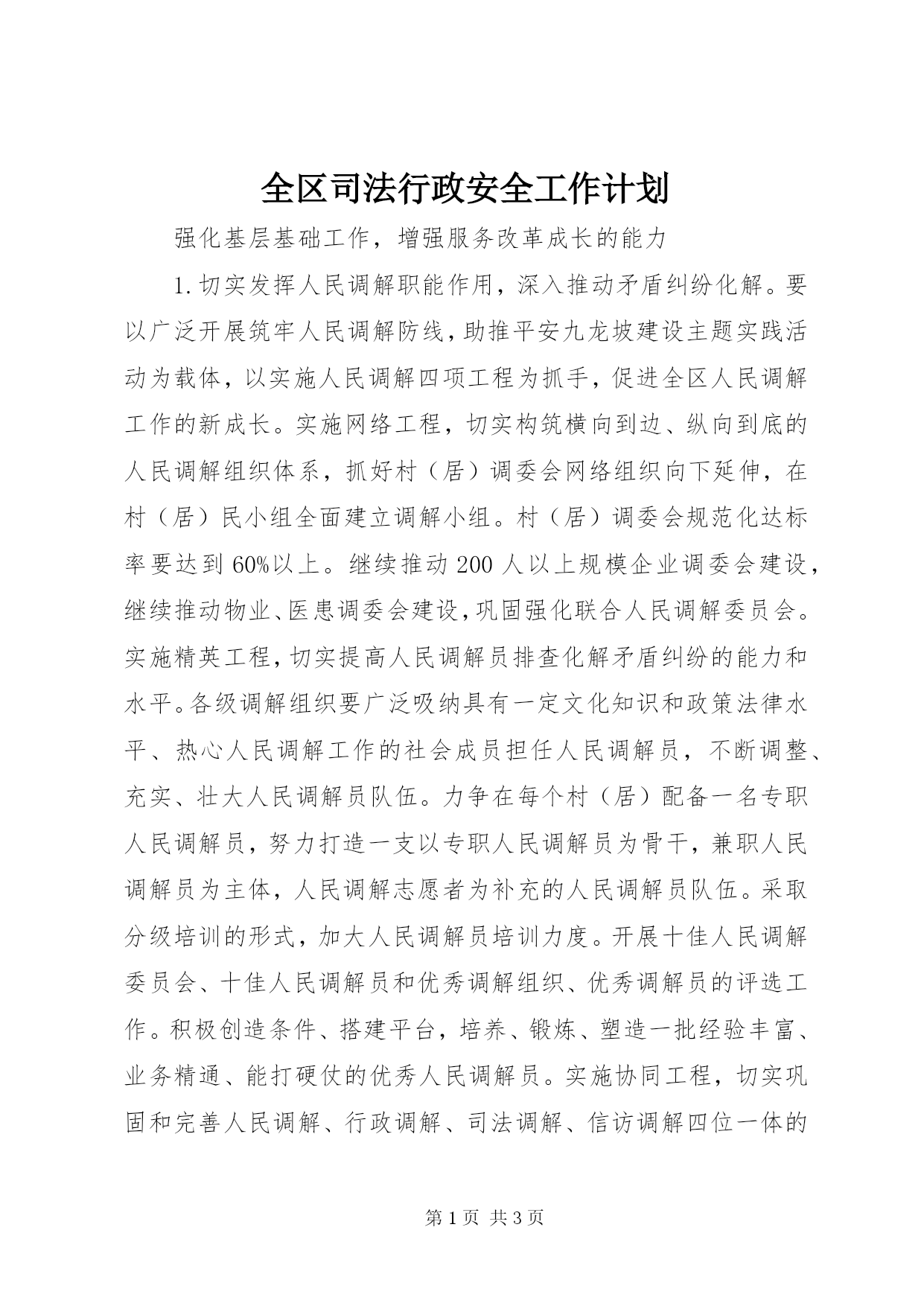 第PAGE\*Arabic\*MERGEFORMAT3页共NUMPAGES\*MERGEFORMAT3页全区司法行政安全工作计划强化基层基础工作,增强服务改革成长的能力1.切实发挥人民调解职能作用,深入推动矛盾纠纷化解。要以广泛开展筑牢人民调解防线,助推平安九龙坡建设主题实践活动为载体,以实施人民调解四项工程为抓手,促进全区人民调解工作的新成长。实施网络工程,切实构筑横向到边、纵向到底的人民调解组织体系,抓好村(居)调委会网络组织向下延伸,在村(居)民小组全面建立调解小组。村(居)调委会规范化