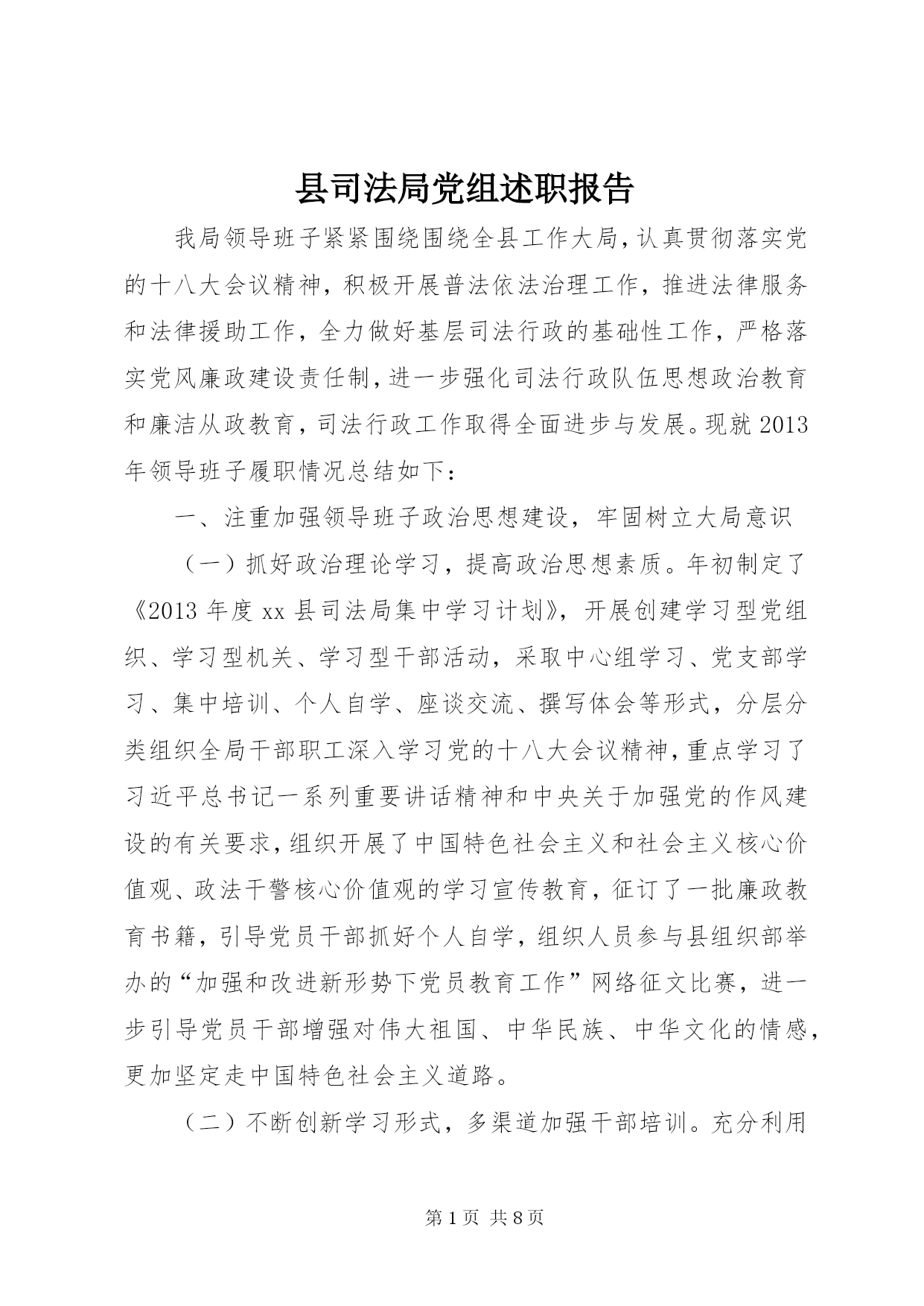 第PAGE\*Arabic\*MERGEFORMAT8页共NUMPAGES\*MERGEFORMAT8页县司法局党组述职报告我局领导班子紧紧围绕围绕全县工作大局,认真贯彻落实党的十八大会议精神,积极开展普法依法治理工作,推进法律服务和法律援助工作,全力做好基层司法行政的基础性工作,严格落实党风廉政建设责任制,进一步强化司法行政队伍思想政治教育和廉洁从政教育,司法行政工作取得全面进步与发展。现就2013年领导班子履职情况总结如下:一、注重加强领导班子政治思想建设,牢固树立大局意识(一)抓好政治理