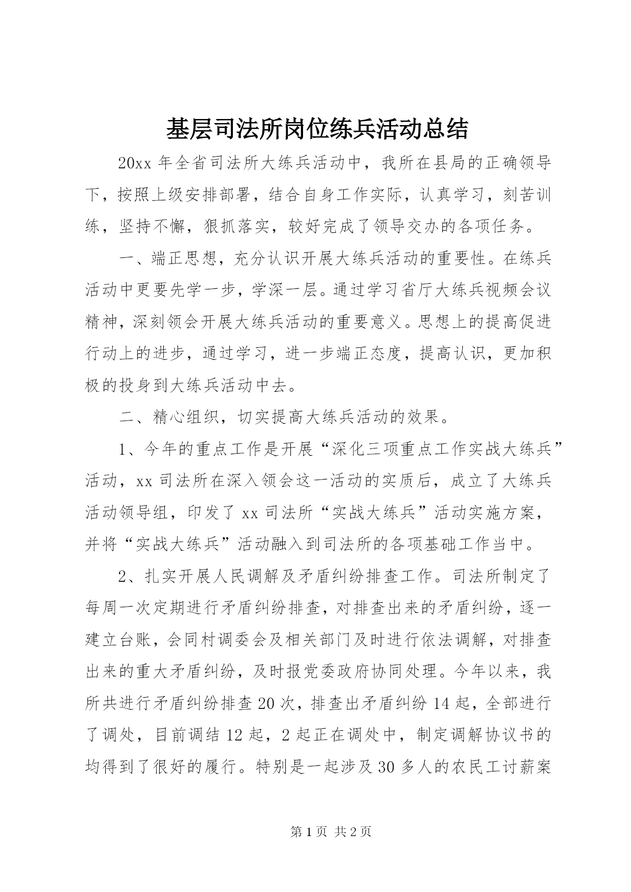 第PAGE\*Arabic\*MERGEFORMAT2页共NUMPAGES\*MERGEFORMAT2页基层司法所岗位练兵活动总结20xx年全省司法所大练兵活动中,我所在县局的正确领导下,按照上级安排部署,结合自身工作实际,认真学习,刻苦训练,坚持不懈,狠抓落实,较好完成了领导交办的各项任务。一、端正思想,充分认识开展大练兵活动的重要性。在练兵活动中更要先学一步,学深一层。通过学习省厅大练兵视频会议精神,深刻领会开展大练兵活动的重要意义。思想上的提高促进行动上的进步,通过学习,进一步端正态度,