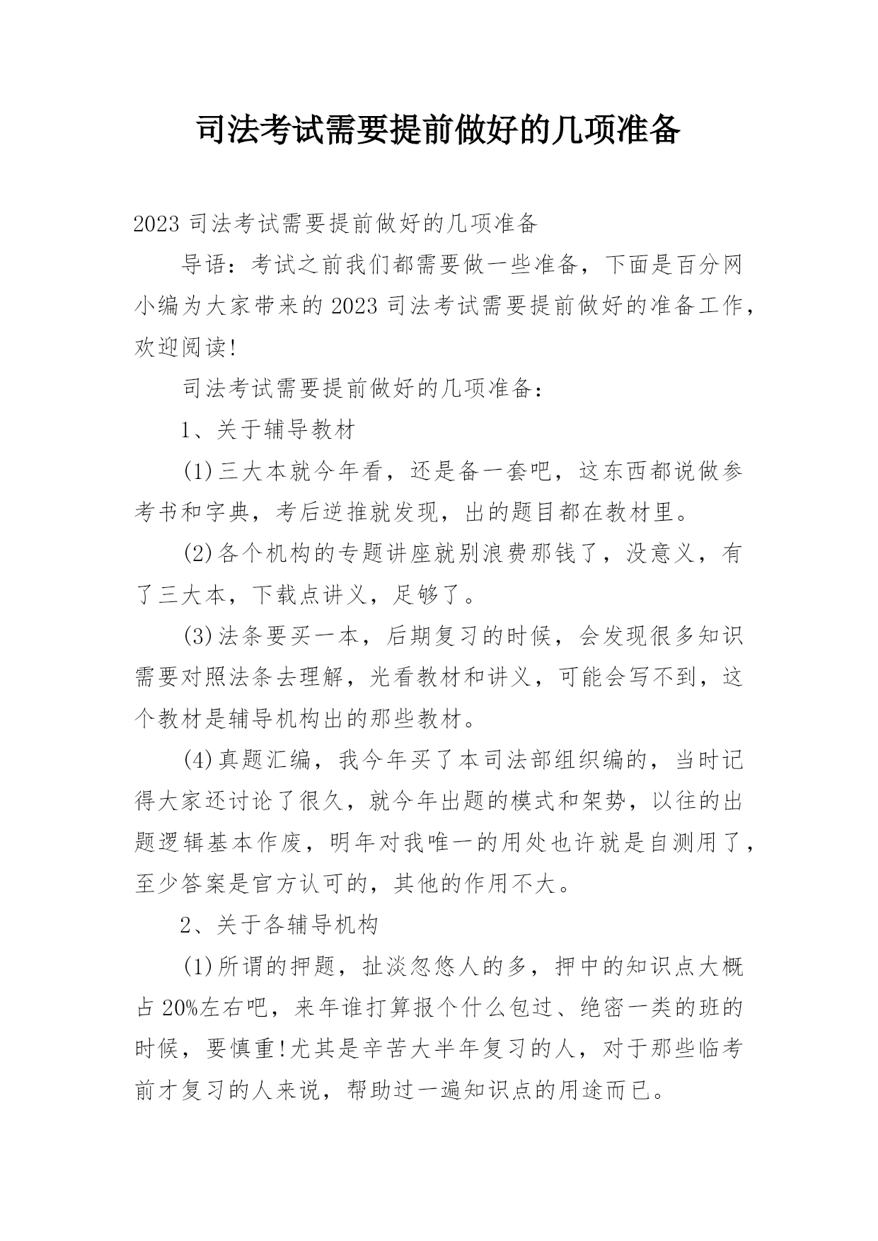 司法考试需要提前做好的几项准备2023司法考试需要提前做好的几项准备导语:考试之前我们都需要做一些准备,下面是百分网小编为大家带来的2023司法考试需要提前做好的准备工作,欢迎阅读!司法考试需要提前做好的几项准备:1、关于辅导教材(1)三大本就今年看,还是备一套吧,这东西都说做参考书和字典,考后逆推就发现,出的题目都在教材里。(2)各个机构的专题讲座就别浪费那钱了,没意义,有了三大本,下载点讲义,足够了。(3)法条要买一本,后期复习的时候,会发现很多知识需要对照法条去理解,光看教材和讲义,可能会写不到,这