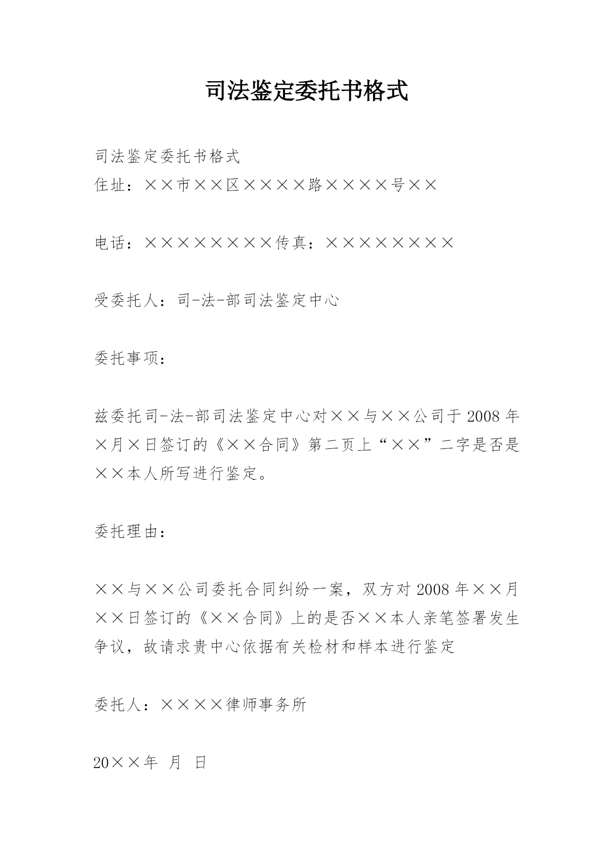 司法鉴定委托书格式司法鉴定委托书格式住址:××市××区××××路××××号××电话:××××××××传真:××××××××受委托人:司-法-部司法鉴定中心委托事项:兹委托司-法-部司法鉴定中心对××与××公司于2008年×月×日签订的《××合同》第二页上“××”二字是否是××本人所写进行鉴定。委托理由:××与××公司委托合同纠纷一案,双方对2008年××月××日签订的《××合同》上的是否××本人亲笔签署发生争议,故请求贵中心依据有关检材和样本进行鉴定委托人:××××律师事务所20××年月日●司法鉴定委托书