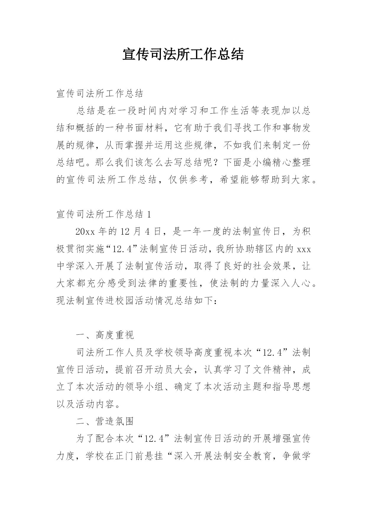 宣传司法所工作总结宣传司法所工作总结总结是在一段时间内对学习和工作生活等表现加以总结和概括的一种书面材料,它有助于我们寻找工作和事物发展的规律,从而掌握并运用这些规律,不如我们来制定一份总结吧。那么我们该怎么去写总结呢?下面是小编精心整理的宣传司法所工作总结,仅供参考,希望能够帮助到大家。宣传司法所工作总结120xx年的12月4日,是一年一度的法制宣传日,为积极贯彻实施“12.4”法制宣传日活动,我所协助辖区内的xxx中学深入开展了法制宣传活动,取得了良好的社会效果,让大家都充分感受到法律的重要性,使法制