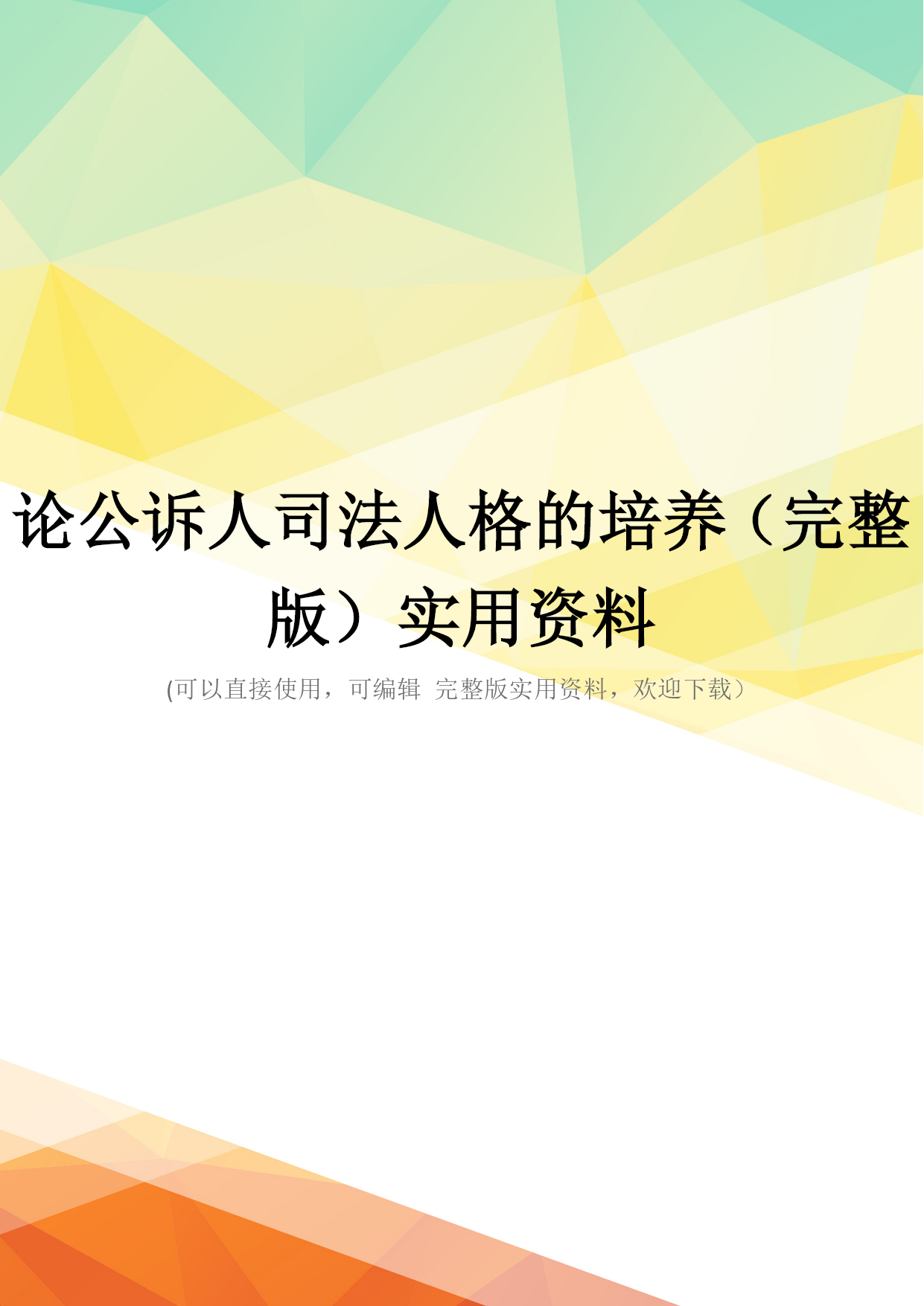 论公诉人司法人格的培养(完整版)实用资料(可以直接使用,可编辑完整版实用资料,欢迎下载)论公诉人司法人格的培养[摘要]公诉人职业的特性要求其应当具备高尚的司法人格,成为社会道德的楷模,这对于促进司法公正、实现社会正义具有重要的作用。公诉人司法人格具有个体性与司法道德的社会性相结合的特点,它由司法理性、司法情感、司法习惯和司法技能等要素组成。培养公诉人的司法人格要从个体、集体和社会等不同层次全面推进。[关键词]职业道德;司法人格;司法伦理司法的经验一再证明,与具体的法律制度相比较,司法过程中最捉摸不定、最难