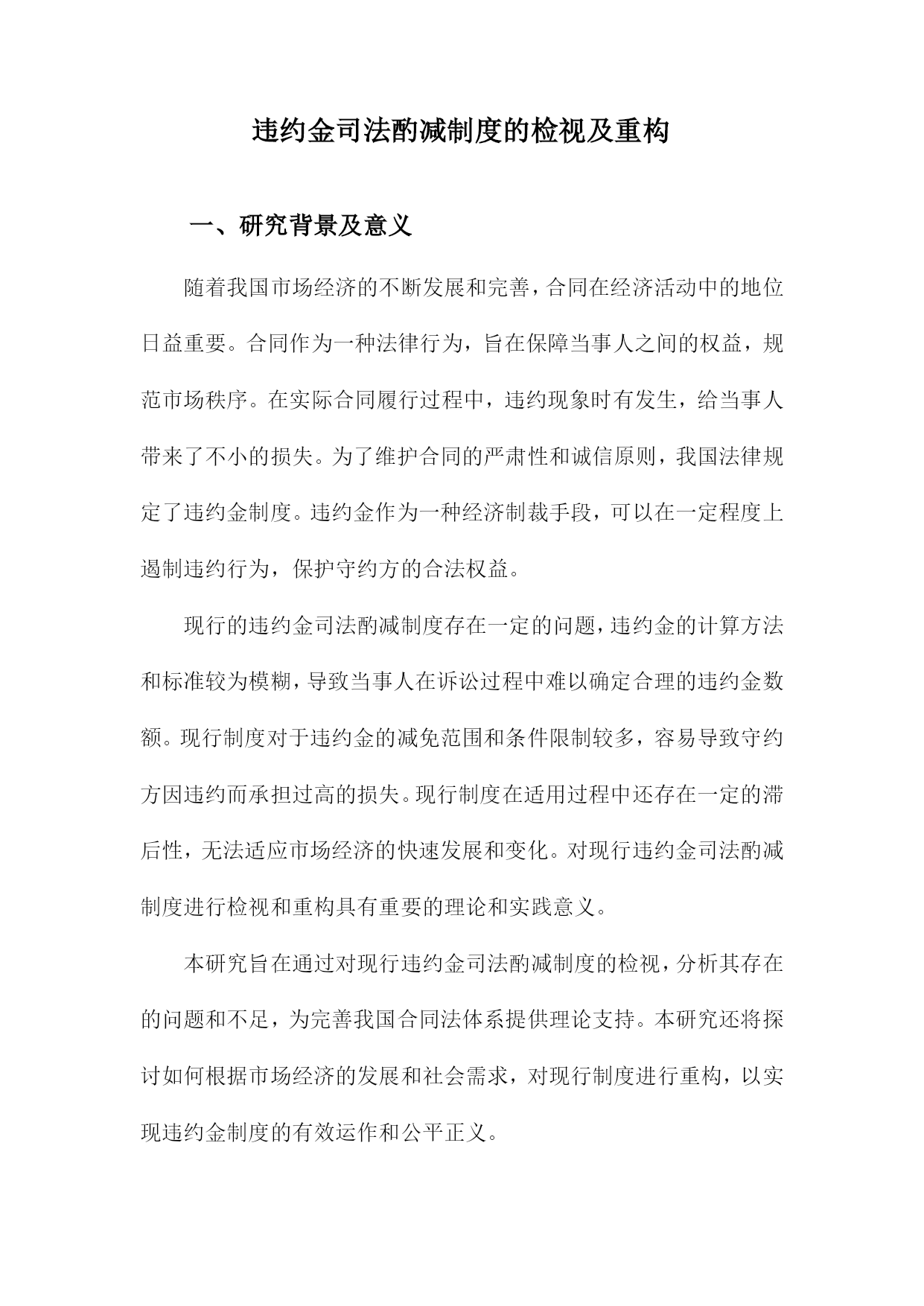 违约金司法酌减制度的检视及重构一、研究背景及意义随着我国市场经济的不断发展和完善,合同在经济活动中的地位日益重要。合同作为一种法律行为,旨在保障当事人之间的权益,规范市场秩序。在实际合同履行过程中,违约现象时有发生,给当事人带来了不小的损失。为了维护合同的严肃性和诚信原则,我国法律规定了违约金制度。违约金作为一种经济制裁手段,可以在一定程度上遏制违约行为,保护守约方的合法权益。现行的违约金司法酌减制度存在一定的问题,违约金的计算方法和标准较为模糊,导致当事人在诉讼过程中难以确定合理的违约金数额。现行制度对