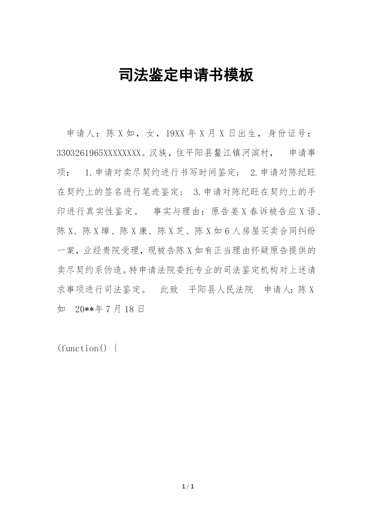 PAGE1/NUMPAGES1司法鉴定申请书模板申请人:陈X如,女,19XX年X月X日出生,身份证号:3303261965XXXXXXXX。汉族,住平阳县鳌江镇河滨村,申请事项:1.申请对卖尽契约进行书写时间鉴定;2.申请对陈纪旺在契约上的签名进行笔迹鉴定;3.申请对陈纪旺在契约上的手印进行真实性鉴定。事实与理由:原告姜X春诉被告应X语、陈X、陈X璋、陈X康、陈X芝、陈X如6人房屋买卖合同纠纷一案,业经贵院受理,现被告陈X如有正当理由怀疑原告提供的卖尽契约系伪造。特申请法院委托专业的司法鉴定机
