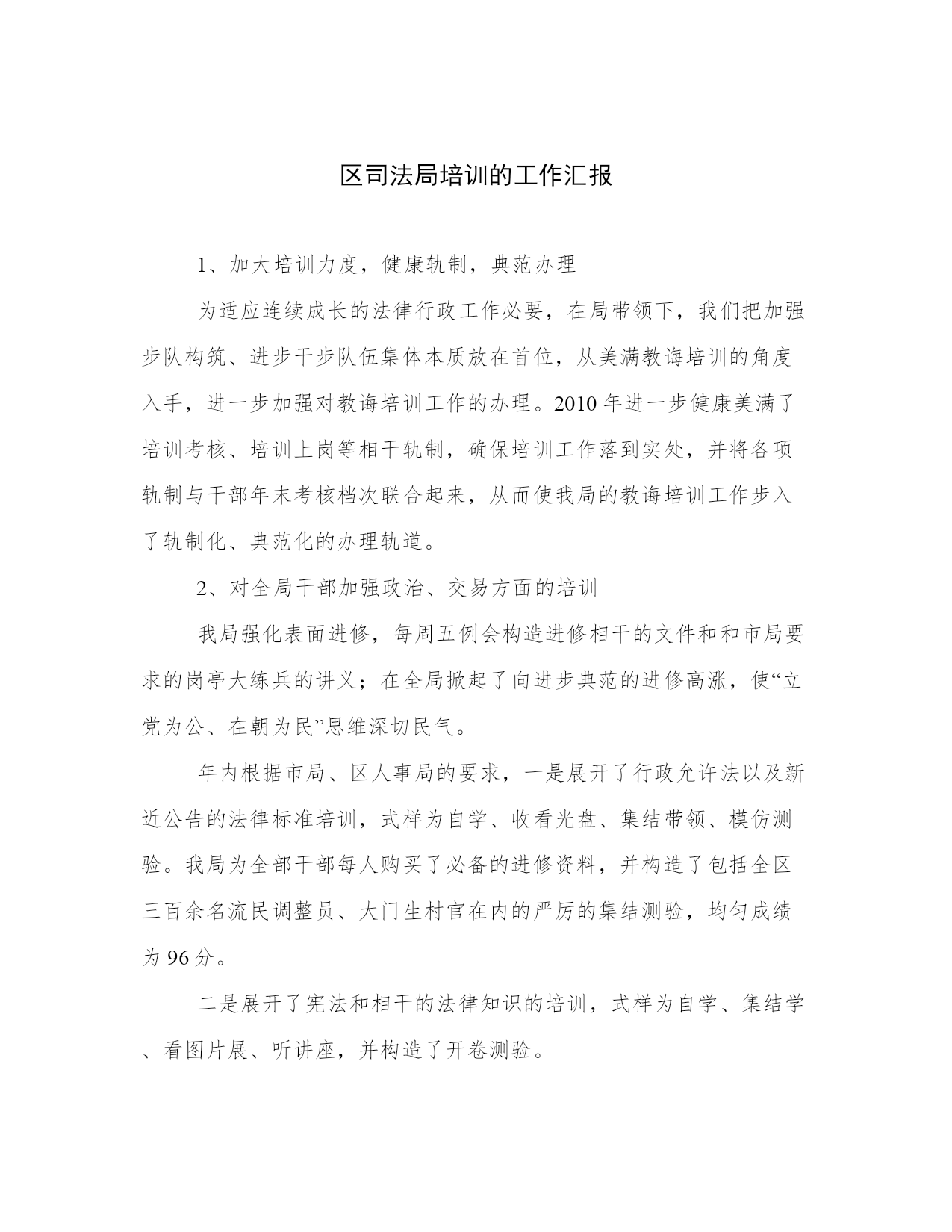 区司法局培训的工作汇报1、加大培训力度,健康轨制,典范办理为适应连续成长的法律行政工作必要,在局带领下,我们把加强步队构筑、进步干步队伍集体本质放在首位,从美满教诲培训的角度入手,进一步加强对教诲培训工作的办理。2010年进一步健康美满了培训考核、培训上岗等相干轨制,确保培训工作落到实处,并将各项轨制与干部年末考核档次联合起来,从而使我局的教诲培训工作步入了轨制化、典范化的办理轨道。2、对全局干部加强政治、交易方面的培训我局强化表面进修,每周五例会构造进修相干的文件和和市局要求的岗亭大练兵的讲义;在全局掀