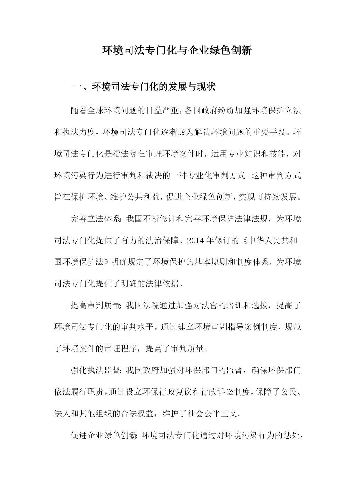 环境司法专门化与企业绿色创新一、环境司法专门化的发展与现状随着全球环境问题的日益严重,各国政府纷纷加强环境保护立法和执法力度,环境司法专门化逐渐成为解决环境问题的重要手段。环境司法专门化是指法院在审理环境案件时,运用专业知识和技能,对环境污染行为进行审判和裁决的一种专业化审判方式。这种审判方式旨在保护环境、维护公共利益,促进企业绿色创新,实现可持续发展。完善立法体系:我国不断修订和完善环境保护法律法规,为环境司法专门化提供了有力的法治保障。2014年修订的《中华人民共和国环境保护法》明确规定了环境保护的基