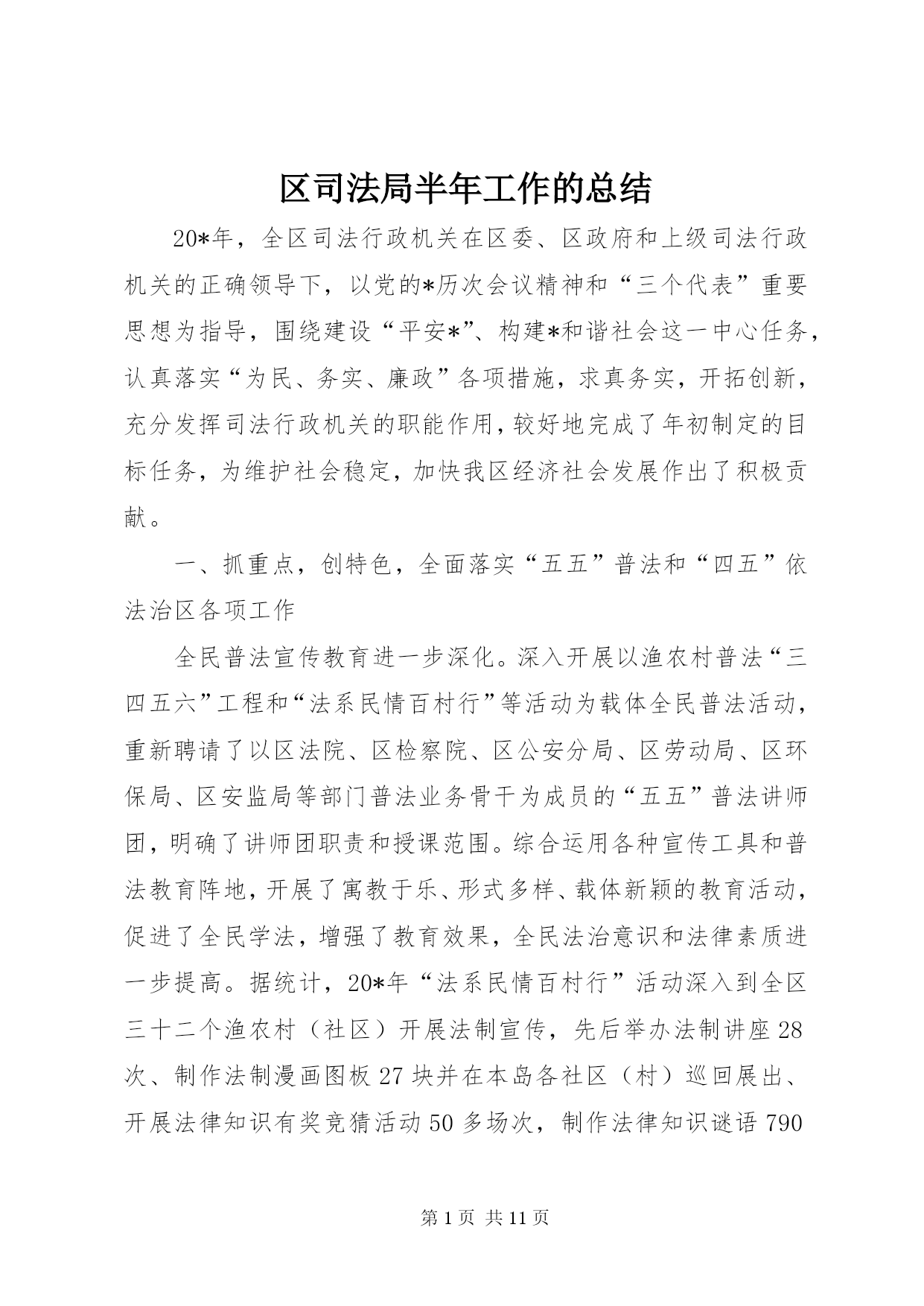 第PAGE\*Arabic\*MERGEFORMAT11页共NUMPAGES\*MERGEFORMAT11页区司法局半年工作的总结20*年,全区司法行政机关在区委、区政府和上级司法行政机关的正确领导下,以党的*历次会议精神和“三个代表”重要思想为指导,围绕建设“平安*”、构建*和谐社会这一中心任务,认真落实“为民、务实、廉政”各项措施,求真务实,开拓创新,充分发挥司法行政机关的职能作用,较好地完成了年初制定的目标任务,为维护社会稳定,加快我区经济社会发展作出了积极贡献。一、抓重点,创特色,全面