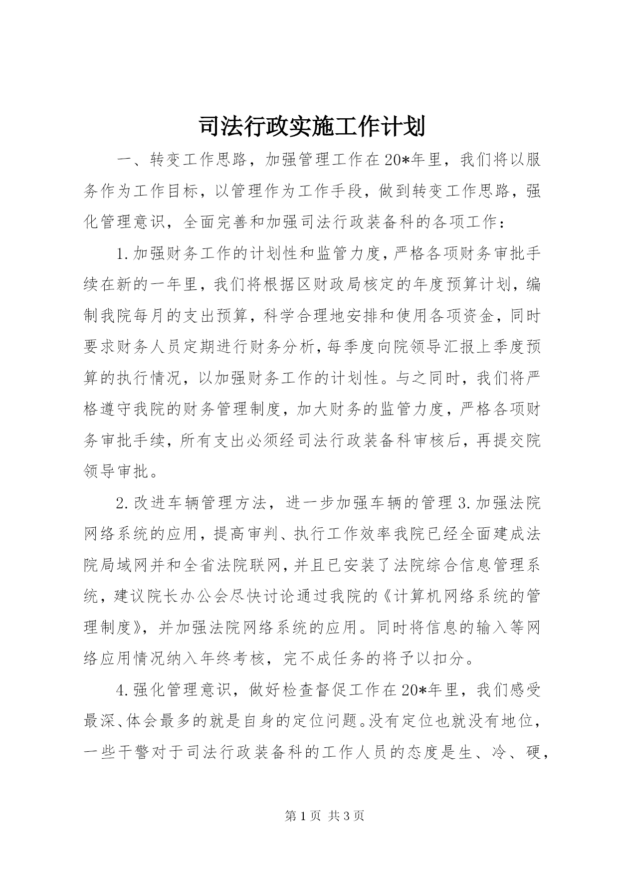 第PAGE\*Arabic\*MERGEFORMAT3页共NUMPAGES\*MERGEFORMAT3页司法行政实施工作计划一、转变工作思路,加强管理工作在20*年里,我们将以服务作为工作目标,以管理作为工作手段,做到转变工作思路,强化管理意识,全面完善和加强司法行政装备科的各项工作:1.加强财务工作的计划性和监管力度,严格各项财务审批手续在新的一年里,我们将根据区财政局核定的年度预算计划,编制我院每月的支出预算,科学合理地安排和使用各项资金,同时要求财务人员定期进行财务分析,每季度向院领导汇