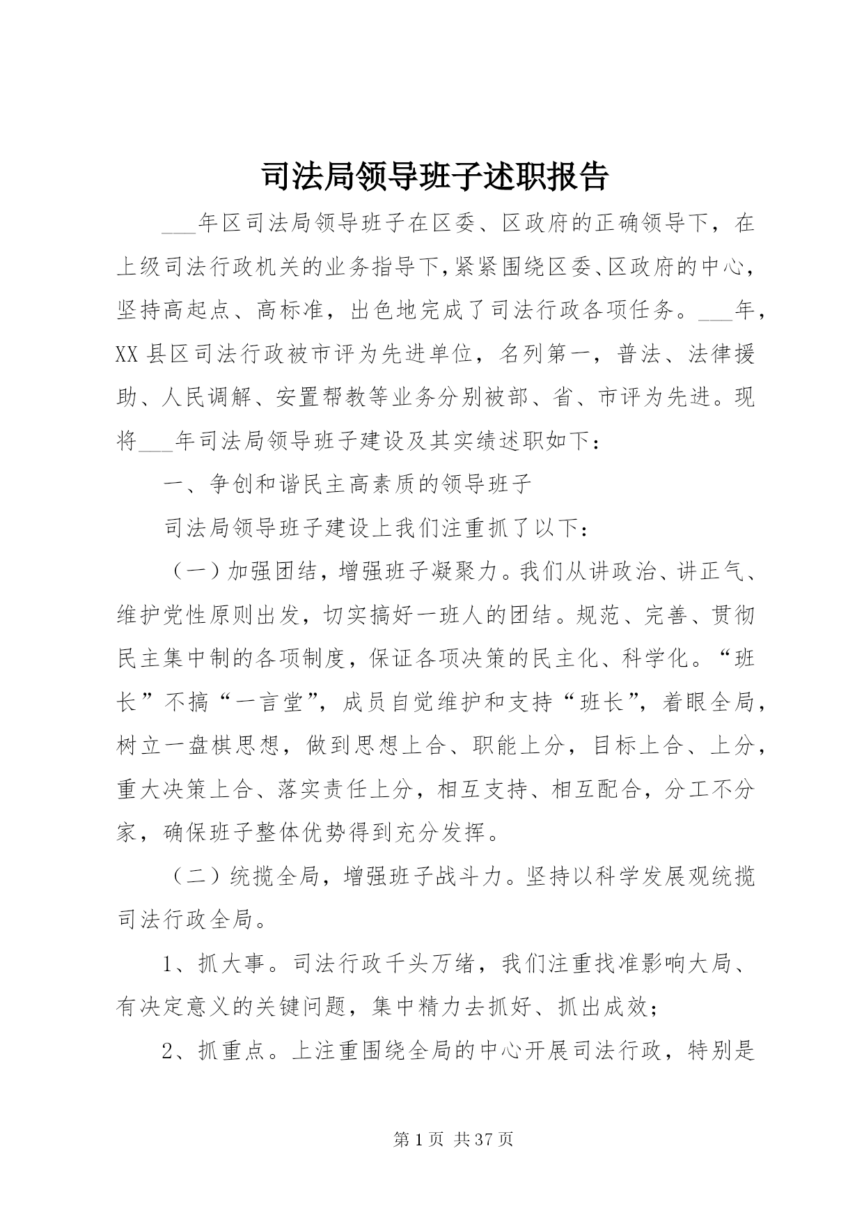 第PAGE\*Arabic\*MERGEFORMAT37页共NUMPAGES\*MERGEFORMAT37页司法局领导班子述职报告___年区司法局领导班子在区委、区政府的正确领导下,在上级司法行政机关的业务指导下,紧紧围绕区委、区政府的中心,坚持高起点、高标准,出色地完成了司法行政各项任务。___年,XX县区司法行政被市评为先进单位,名列第一,普法、法律援助、人民调解、安置帮教等业务分别被部、省、市评为先进。现将___年司法局领导班子建设及其实绩述职如下:一、争创和谐民主高素质的领导班子司法局