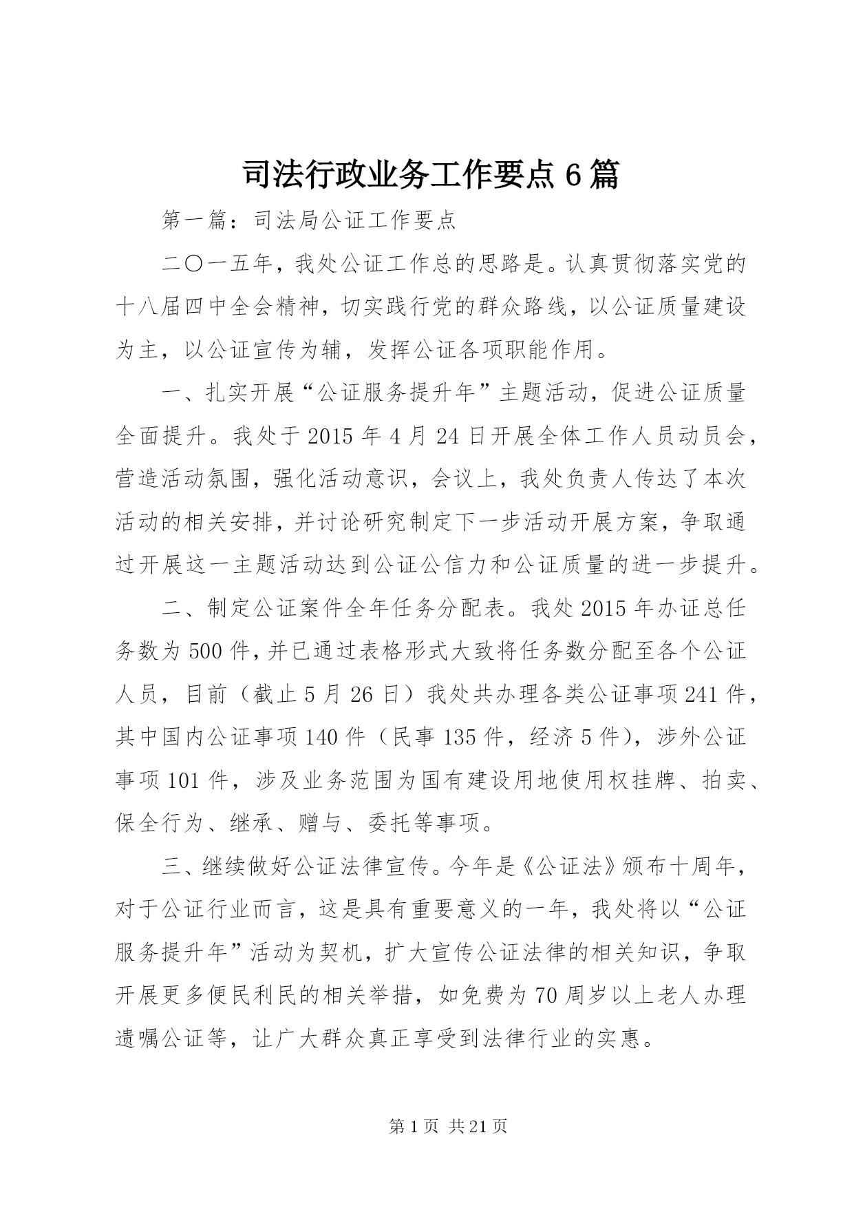 第PAGE\*Arabic\*MERGEFORMAT21页共NUMPAGES\*MERGEFORMAT21页司法行政业务工作要点6篇第一篇:司法局公证工作要点二○一五年,我处公证工作总的思路是。认真贯彻落实党的十八届四中全会精神,切实践行党的群众路线,以公证质量建设为主,以公证宣传为辅,发挥公证各项职能作用。一、扎实开展“公证服务提升年”主题活动,促进公证质量全面提升。我处于2015年4月24日开展全体工作人员动员会,营造活动氛围,强化活动意识,会议上,我处负责人传达了本次活动的相关安排,并讨