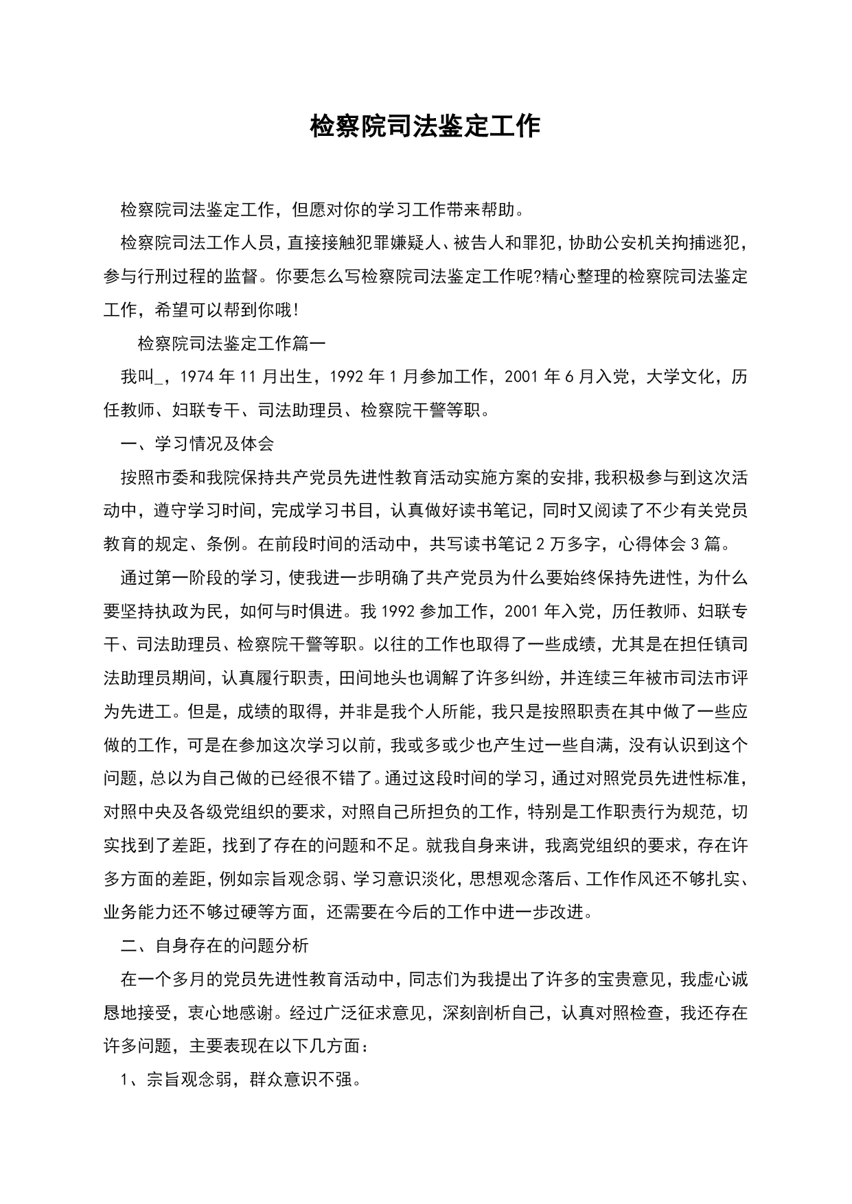 检察院司法鉴定工作检察院司法鉴定工作,但愿对你的学习工作带来帮助。检察院司法工作人员,直接接触犯罪嫌疑人、被告人和罪犯,协助公安机关拘捕逃犯,参与行刑过程的监督。你要怎么写检察院司法鉴定工作呢?精心整理的检察院司法鉴定工作,希望可以帮到你哦!检察院司法鉴定工作篇一我叫_,1974年11月出生,1992年1月参加工作,2001年6月入党,大学文化,历任教师、妇联专干、司法助理员、检察院干警等职。一、学习情况及体会按照市委和我院保持共产党员先进性教育活动实施方案的安排,我积极参与到这次活动中,遵守学习时间,完