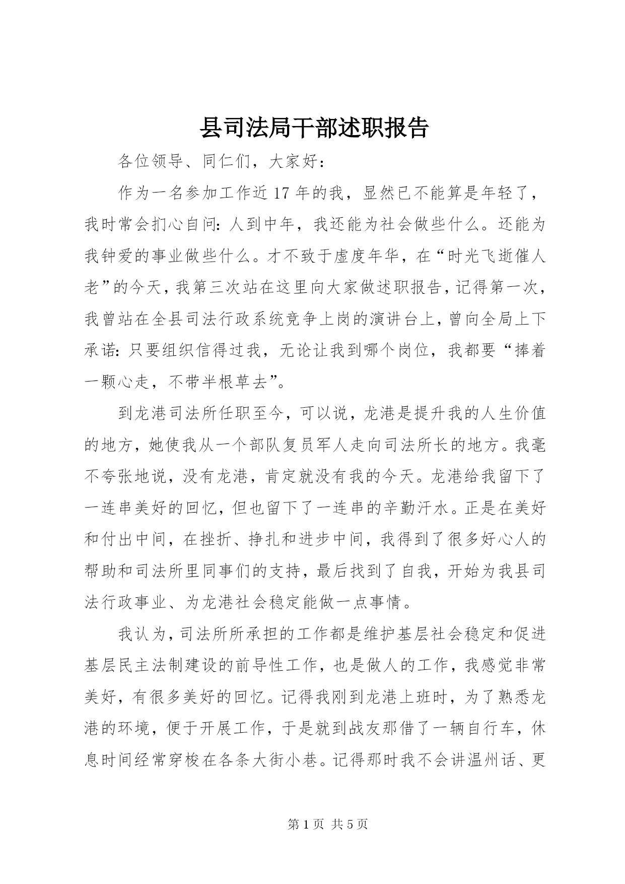 第PAGE\*Arabic\*MERGEFORMAT5页共NUMPAGES\*MERGEFORMAT5页县司法局干部述职报告各位领导、同仁们,大家好:作为一名参加工作近17年的我,显然已不能算是年轻了,我时常会扪心自问:人到中年,我还能为社会做些什么。还能为我钟爱的事业做些什么。才不致于虚度年华,在“时光飞逝催人老”的今天,我第三次站在这里向大家做述职报告,记得第一次,我曾站在全县司法行政系统竞争上岗的演讲台上,曾向全局上下承诺:只要组织信得过我,无论让我到哪个岗位,我都要“捧着一颗心走,不带